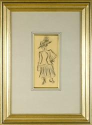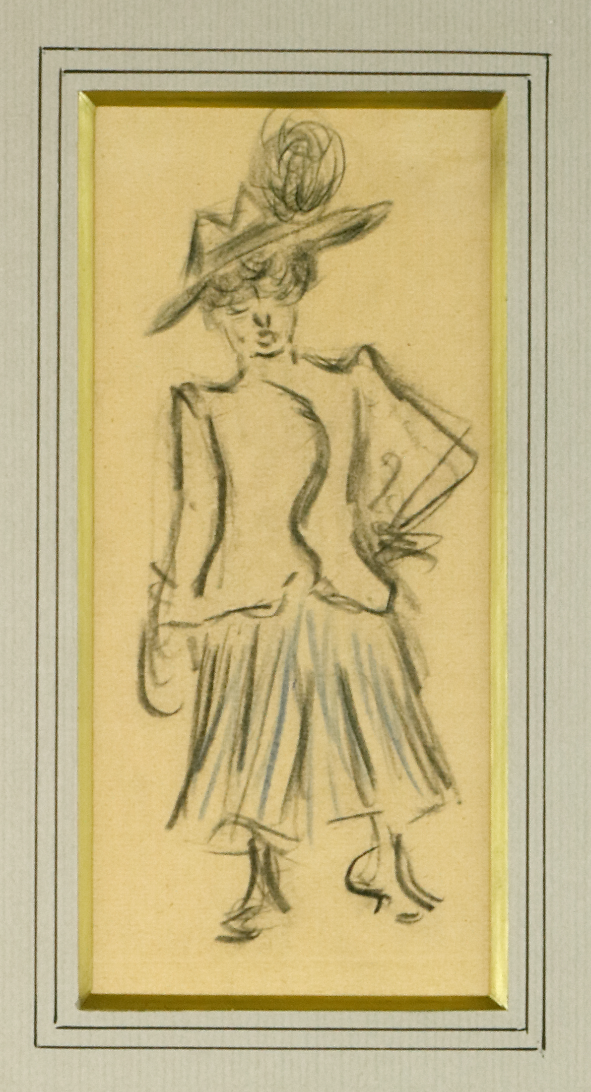 Die Gnädige hat sich fein gemacht. Farbige Kreidezeichnung auf Papier, rückseitig mit der Studie einer Person mit Sack. 15 x 7 cm. Rückseitig mit Nachlassstempel, schwach sichtbar. Im Passepartout, unter Glas gerahmt.  (1066-17)