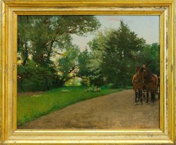 Wartende Pferdedroschke im Park. Öl auf Holz. 25,5 x 33 cm. Rechts unten monogrammiert. Gerahmt. - Provenienz: Galerie Berliner Impressionisten, Berlin, 2000; Berliner Privatbesitz. (1066-19)