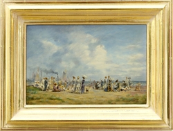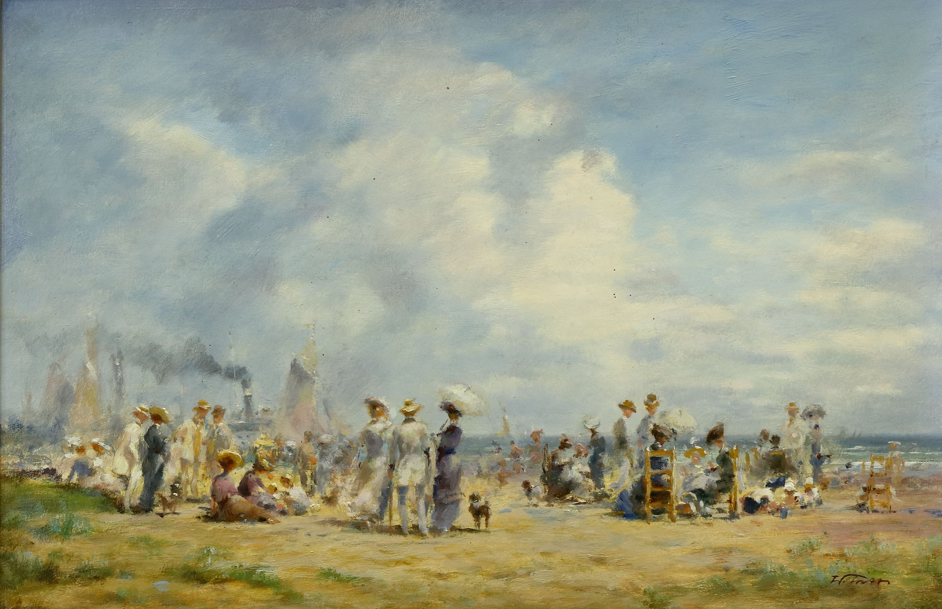 Strandszene an der Côte d`Azur. Öl auf Holz. 20 x 29,8 cm. Rechts unten signiert. Gerahmt. (1066-20)