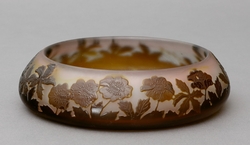 Runde Schale mit kurzem nach innen gezogenem Rand. Milchig weißes Glas, mit Rot/Rotbraunem Über- Unterfang. Umlaufendem Dekor von Blüten und Blättern "en Terrasse" in Hoch- und Tiefätzung. Auf der Wandung in Hochätzung bezeichnet "Gallé", H 4 x D 14 cm. (1066-3)