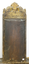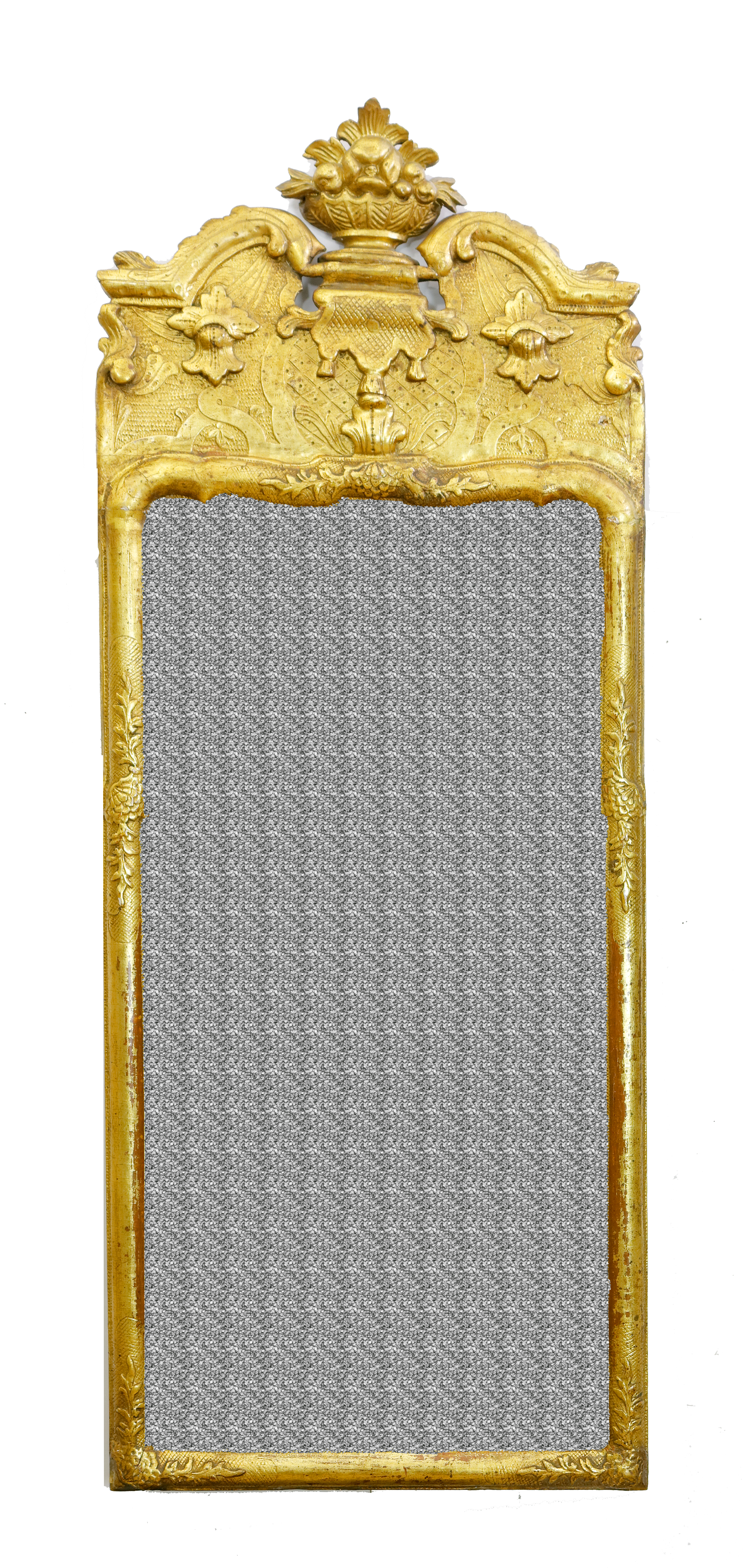 Holz geschnitzt, mit alter Polimentvergoldung, mit Gesso gearbeitet, feiner Punzierung im Fond, Seiten und Ecken mit Blatt-Ornamenten. Vasenbekrönung. Altes, originales Quecksilber-Spiegelglas. H 100 x 40 cm. (1066-30)