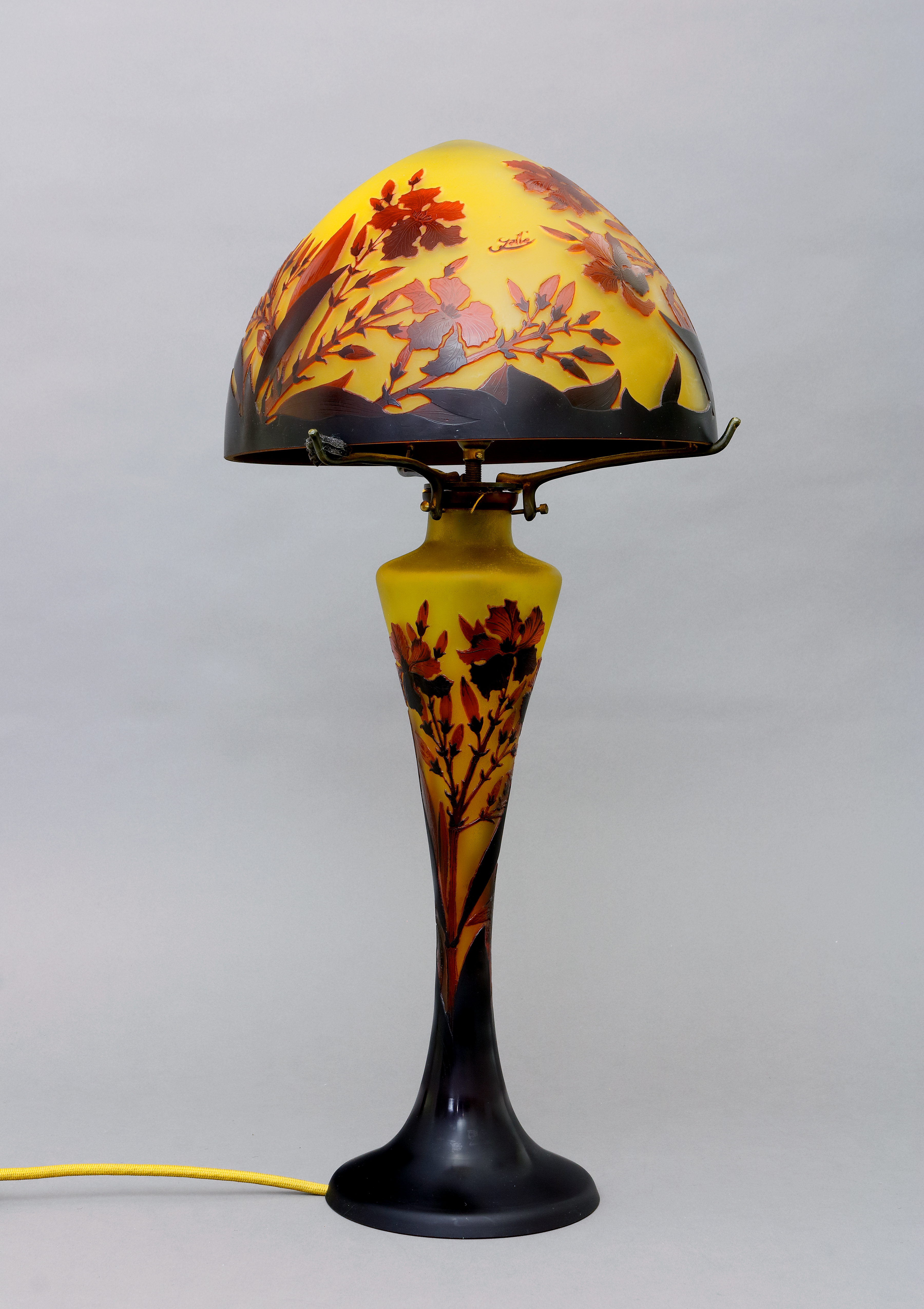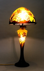 Runder Stand mit konkaver schlanker Wandung und pilzförmiger Haube. Milchig weißes Glas mit verschieden farbigem Über- und Unterfang mit dem geätzten Relief von Clematis Blüten und Blättern. Auf der Wandung in Hochätzung bezeichnet "Gallé". H.: 64 cm. Sehr guter Erhaltungszustand. (1066-31)