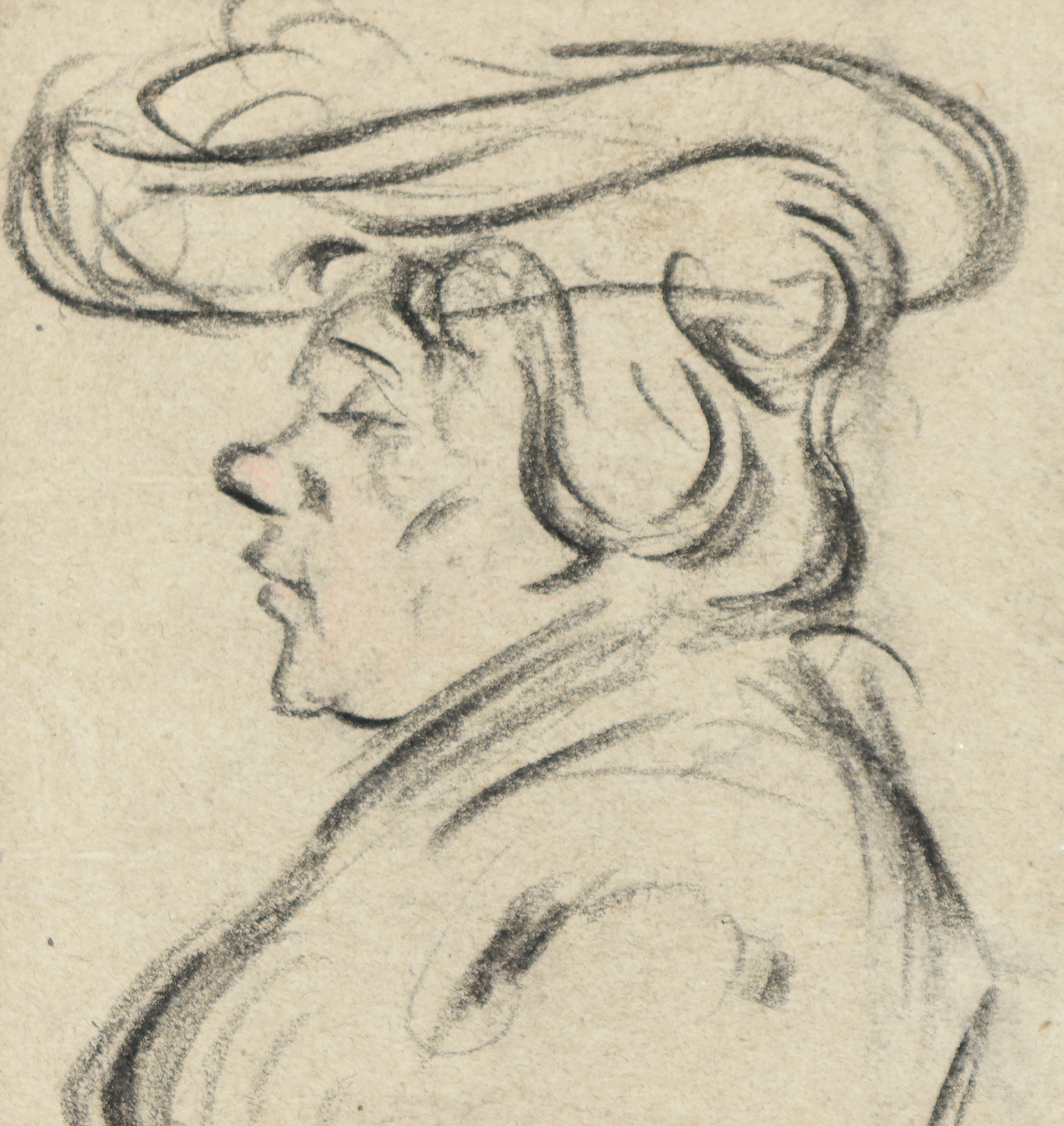 Frau mit Hut nach links. Kohlezeichnung auf beigem Velin. 9,5 x 9 cm. An den Ecken auf die Unterlage montiert. - Eine Zeichnung beigegeben. (1066-35)