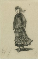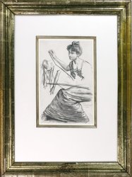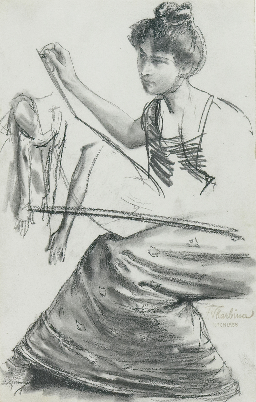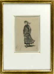 Frau beim Skizzieren. Um 1890. Bleistiftzeichnung auf Velin. 27,3 x 17,4 cm. Rechts unten mit dem roten Nachlassstempel des Künstlers. Freiliegend im Passepartout, unter Glas gerahmt. Eine weitere Zeichnung des Künstlers "Frau mit Stiefeletten" mit Nachlassstempel beigegeben. (1066-36)