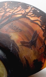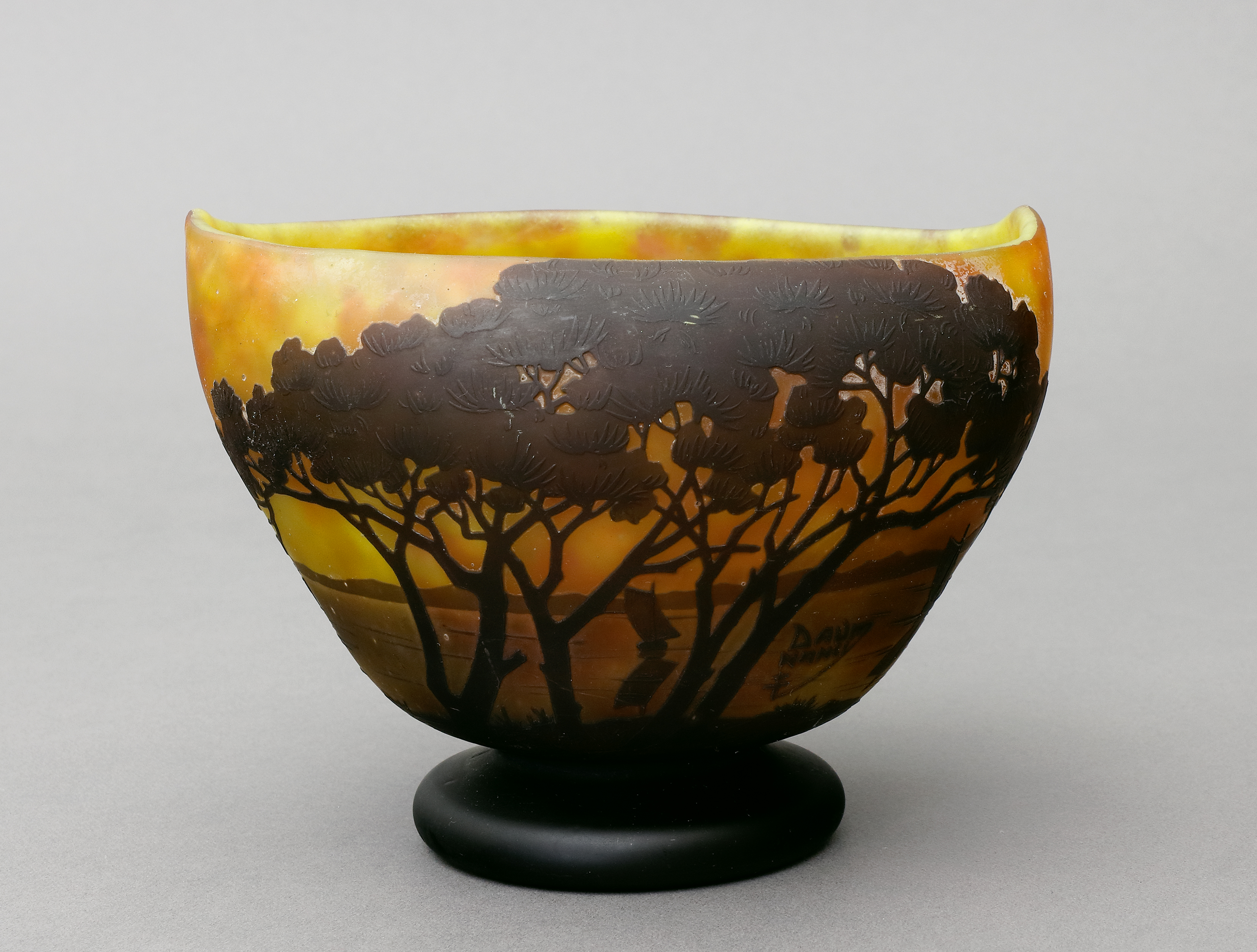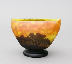 Ovale Balusterform mit hoch gezogenen Ecken und abgesetztem rundem Stand. Farbloses Glas mit Gelb/Roten Pulvereinschmelzungen sowie Braun/Roter Überfang mit Landschaftsmotiven mit Segelbooten in Hoch- und Tiefätzung. Auf der Wandung in Hochätzung bezeichnet "Daum Nancy" mit Lothringer Kreuz. H 9,5 x B 13 x T 8,5 cm. (1066-4)