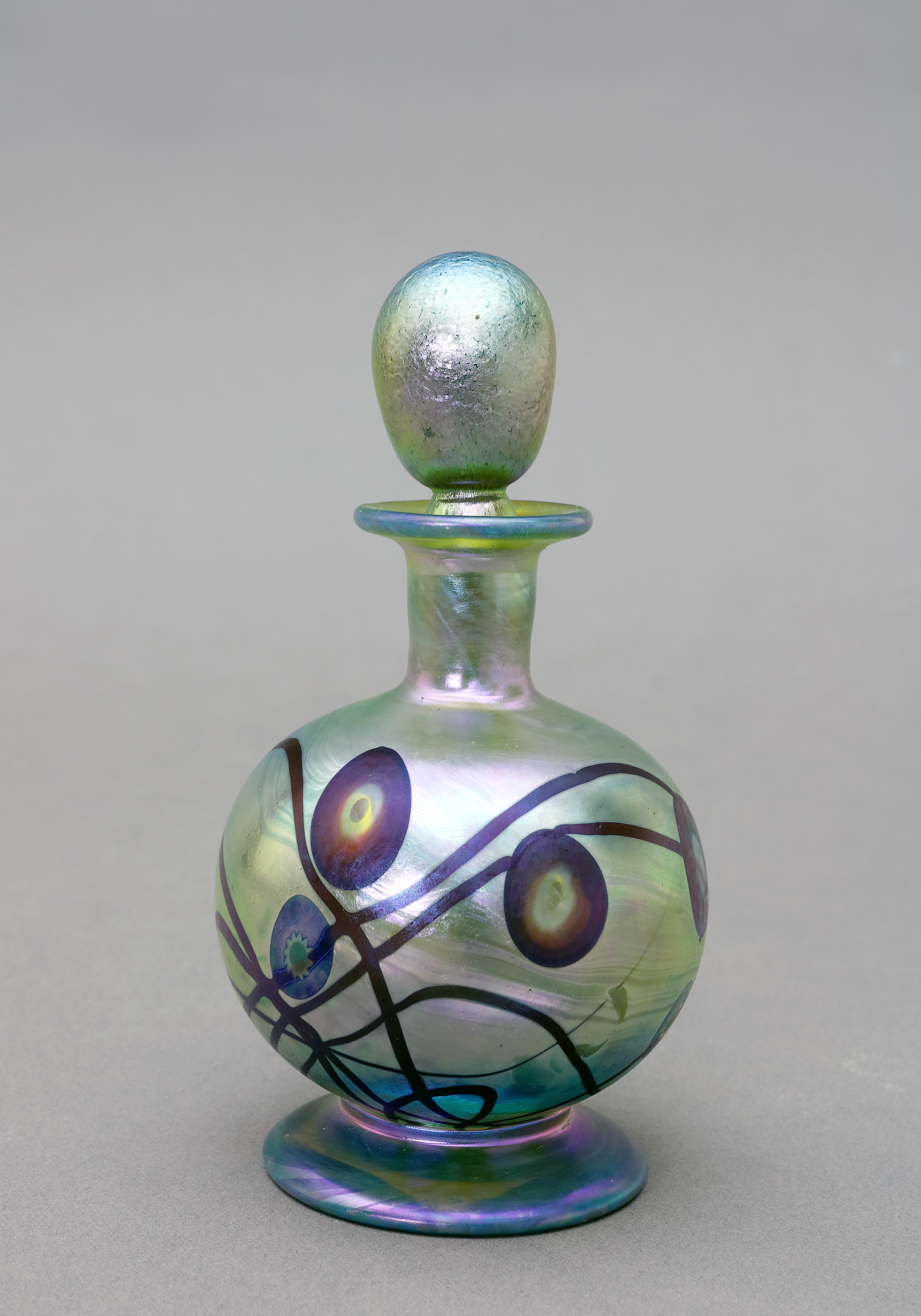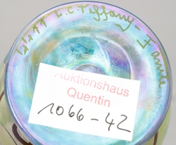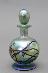 Kugelform mit ovalem Stöpsel. Pfauenaugendekor auf irisierendem grün-goldenem Favrile-Glas. H 13 cm. Im Boden bezeichnet "L. C. Tiffany Favrile 4411". (1066-42)