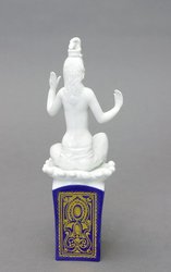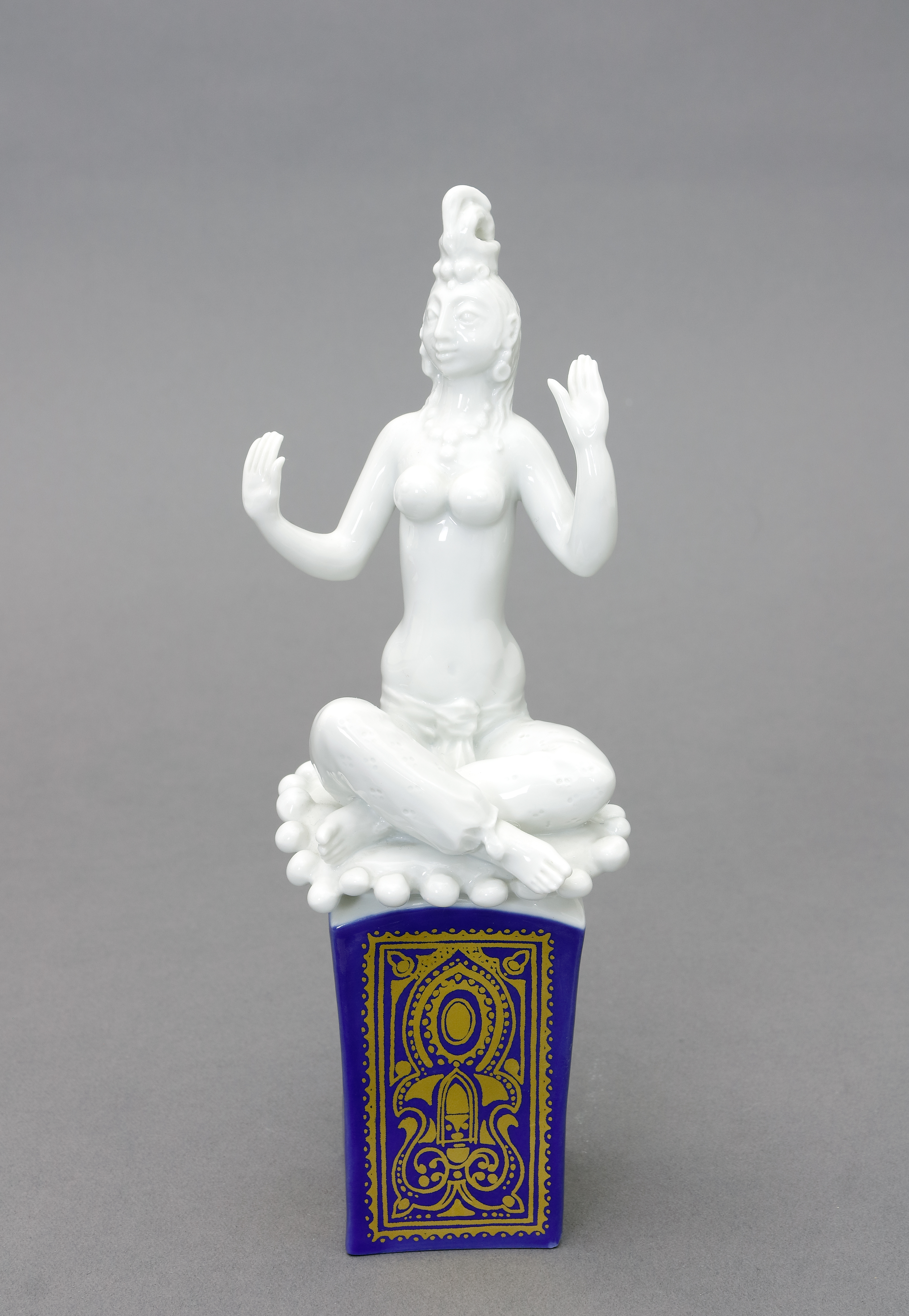 Königin Scheherezade, aus 1001 Nacht. Entwurf Peter Strang, 1980. Auf hohem, blauem, goldornamentiertem Sockel sitzende Figur. H 20 cm. Blaue Schwertermarke, 1. Wahl, Modelln° 67082 sowie Preßnr. 129 B. (1066-45)