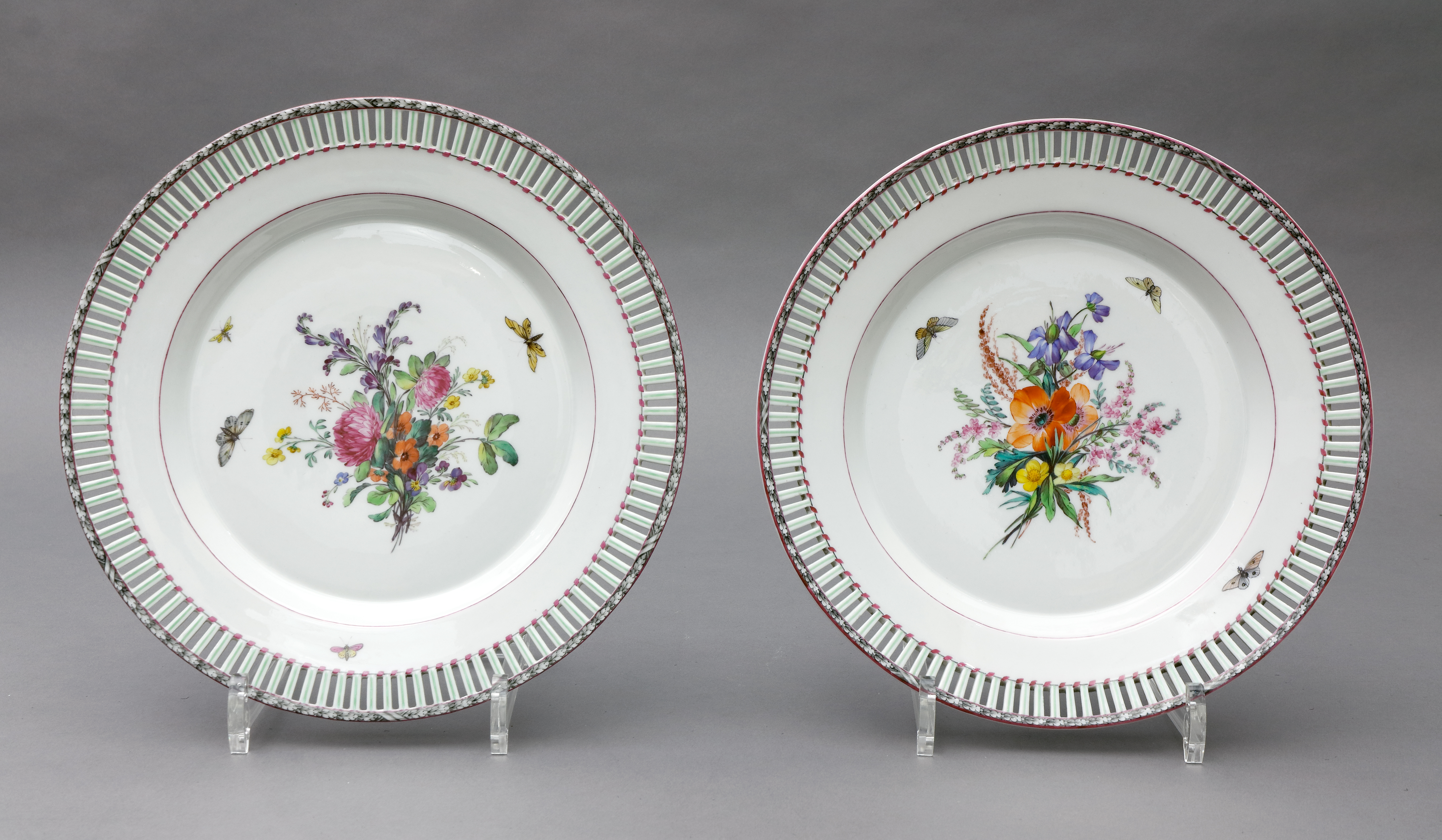 Rund. Farbig gemalte Fahne mit Eichenblattfries. Im Spiegel bunt gemaltes Blumenbouquet mit Schmetterlingen. D 24 cm. Blaue Zeptermarke. - Aus dem Service für die Nichte von Friedrich Wilhelm II., Friederike Luise Wilhelmine, anlässlich Ihrer Hochzeit mit dem Erbprinzen Karl Georg August von Braunschweig-Wolfenbüttel 1791. (1066-46)