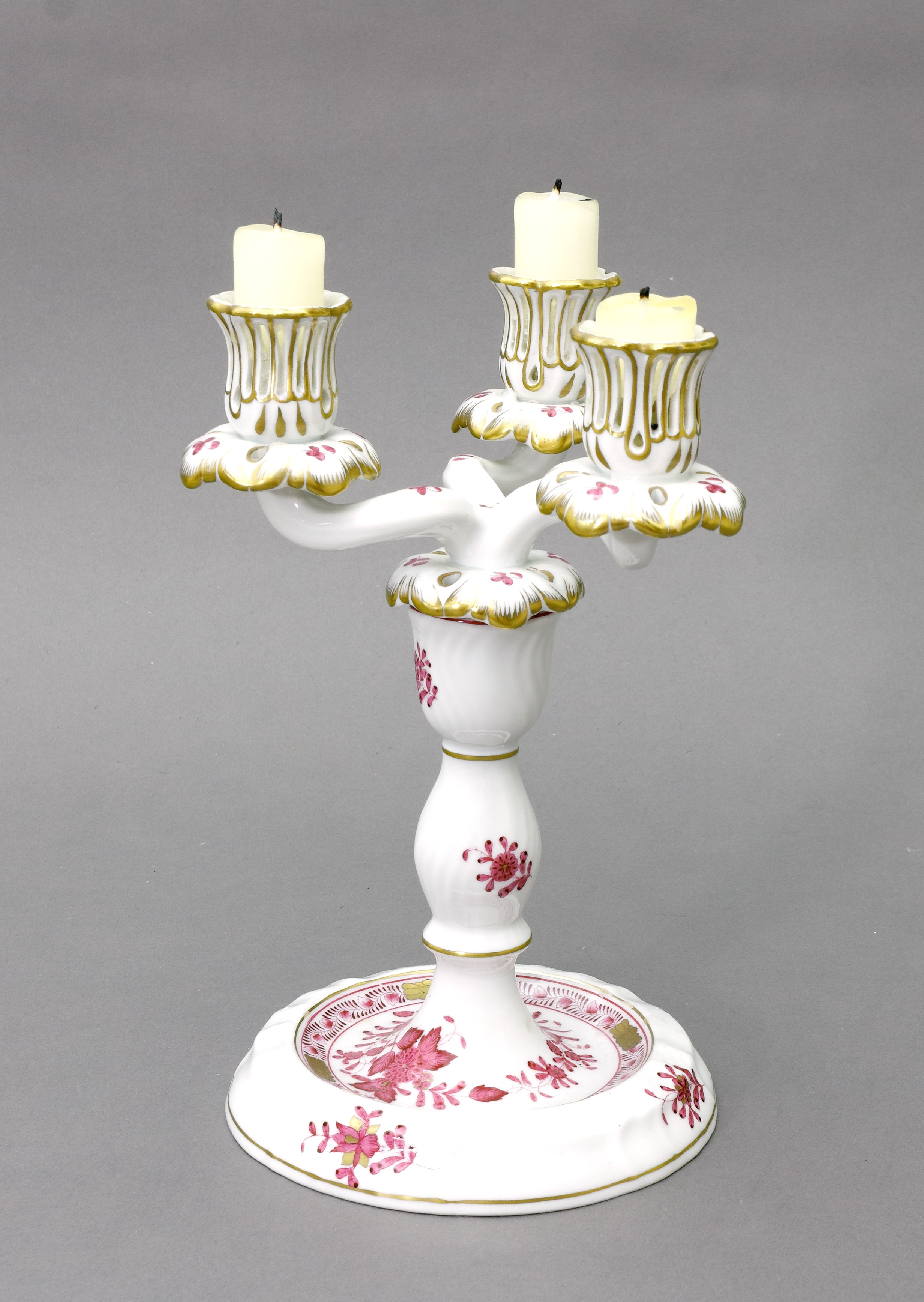 Dreiarmig, abnehmbar. Apponyi Purpur, Goldränder und Goldstaffage. H 22 cm. Blaue Manufakturmarke. (1066-62)