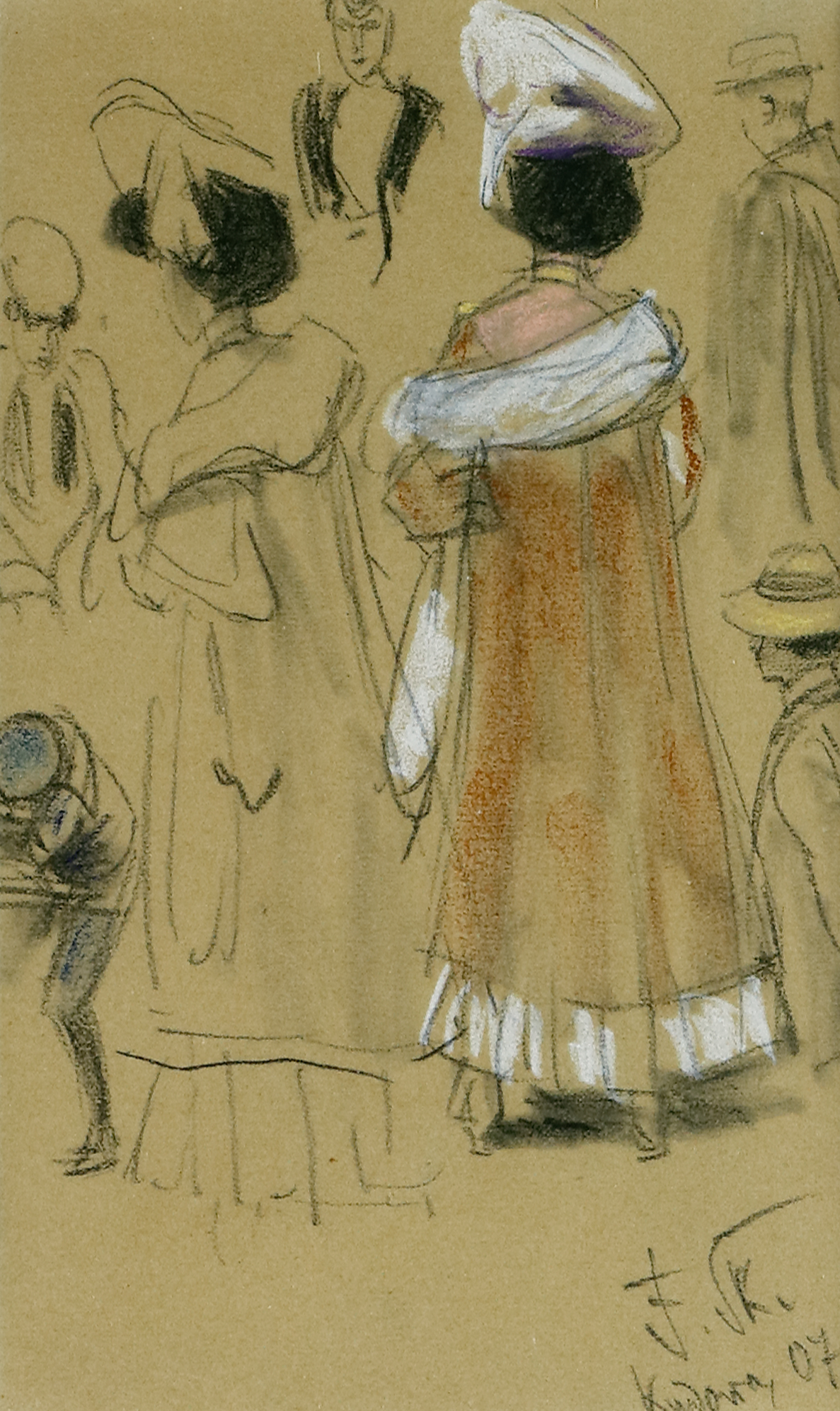 Figurenstudien. Kudowa 1907. Kohle und Pastell auf bräunlichem Papier. Ca. 19,5 x 12,8 cm. Rechts unten monogrammiert und datiert. Im Passepartout, unter Glas gerahmt. - Provenienz: Auktionshaus Quentin, A15, 2008, Lot 146; Berliner Privatbesitz. (1066-8)