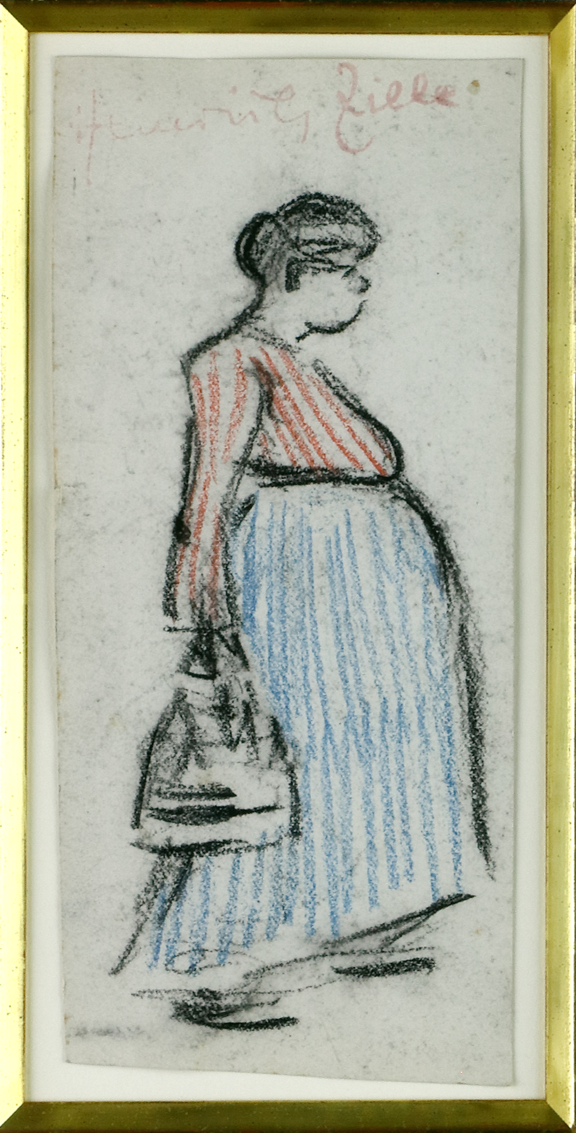 Frau nach rechts, eine Tasche tragend. Schwarze, blaue und rote Kreide/Kohle auf Papier. 21,5 x 10 cm. Am oberen Rand mit dem roten Nachlassstempel des Künstlers. Freiliegend im Passepartout, unter Glas gerahmt. (1066-9)