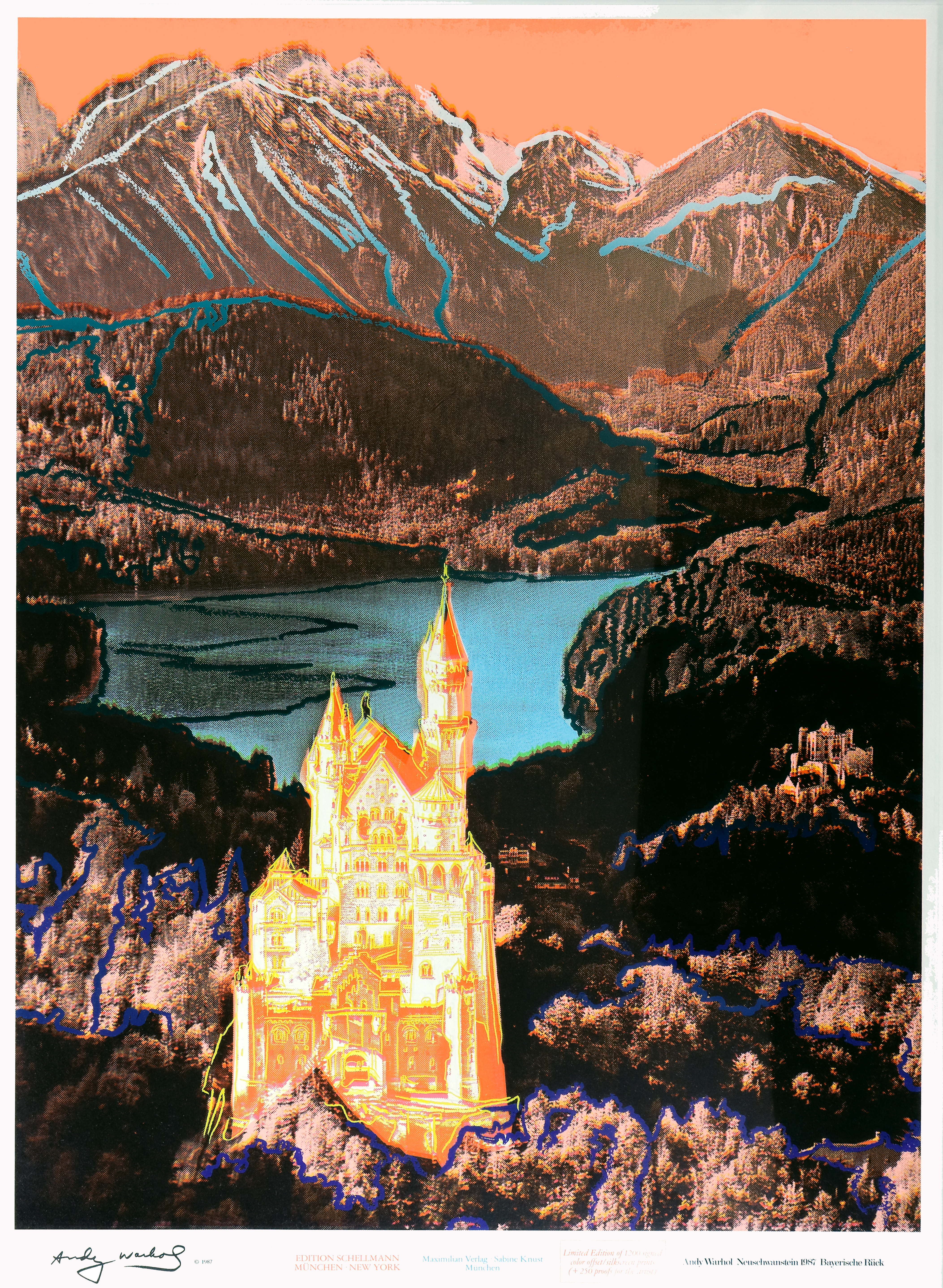 Neuschwanstein. 1987. Farboffsetdruck. 93 x 64,5 cm. Drucksigniert. Unter Glas gerahmt. - 500er Auflage für die Bayerische Rück. Nr. 75. Feldmann & Schellmann Nr. II 372, rückseitig mit Papieretikett. (1067-2)
