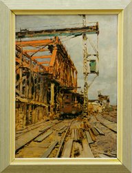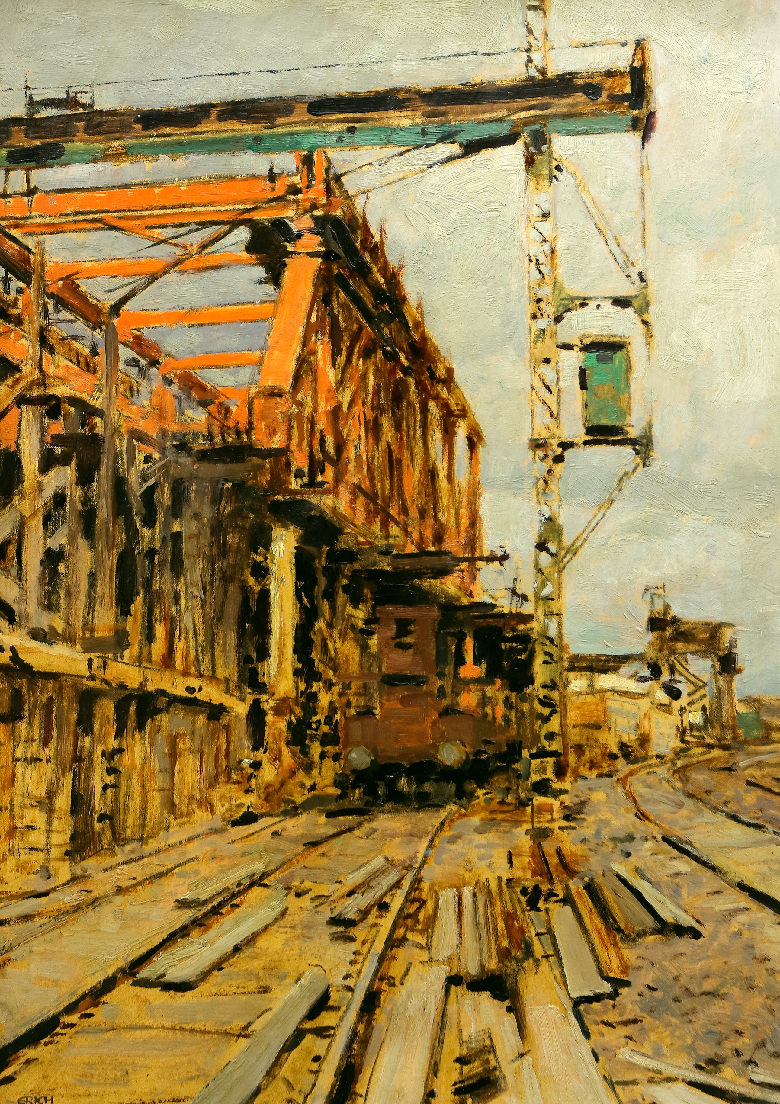 Brückenbau in Berlin. Öl auf Karton. 48 x 35 cm. Links unten signiert sowie rückseitig mit Beglaubigung von Martha Kips, geb. Schumann, von 1959. Gerahmt. (1069-2)