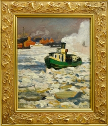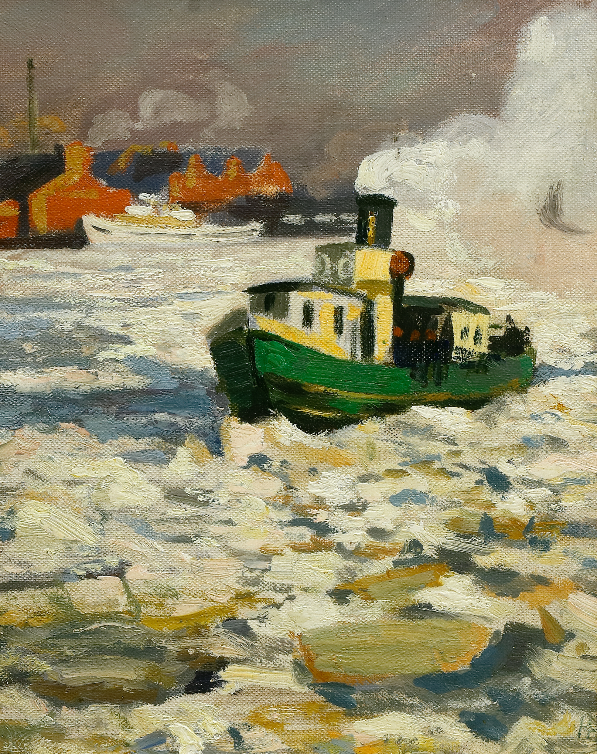 Hamburg: Wintermorgen im Hafen (Schlepper). Öl auf Leinwand auf Malkarton. 30 x 24,3 cm. Rechts unten monogrammiert. Gerahmt. - Das Gemälde ist in Hans Hartigs Verkaufsbuch unter der Nr. 1747 gelistet und wurde am 5. 3. 1930 für RM 75 verkauft. (1071-4)