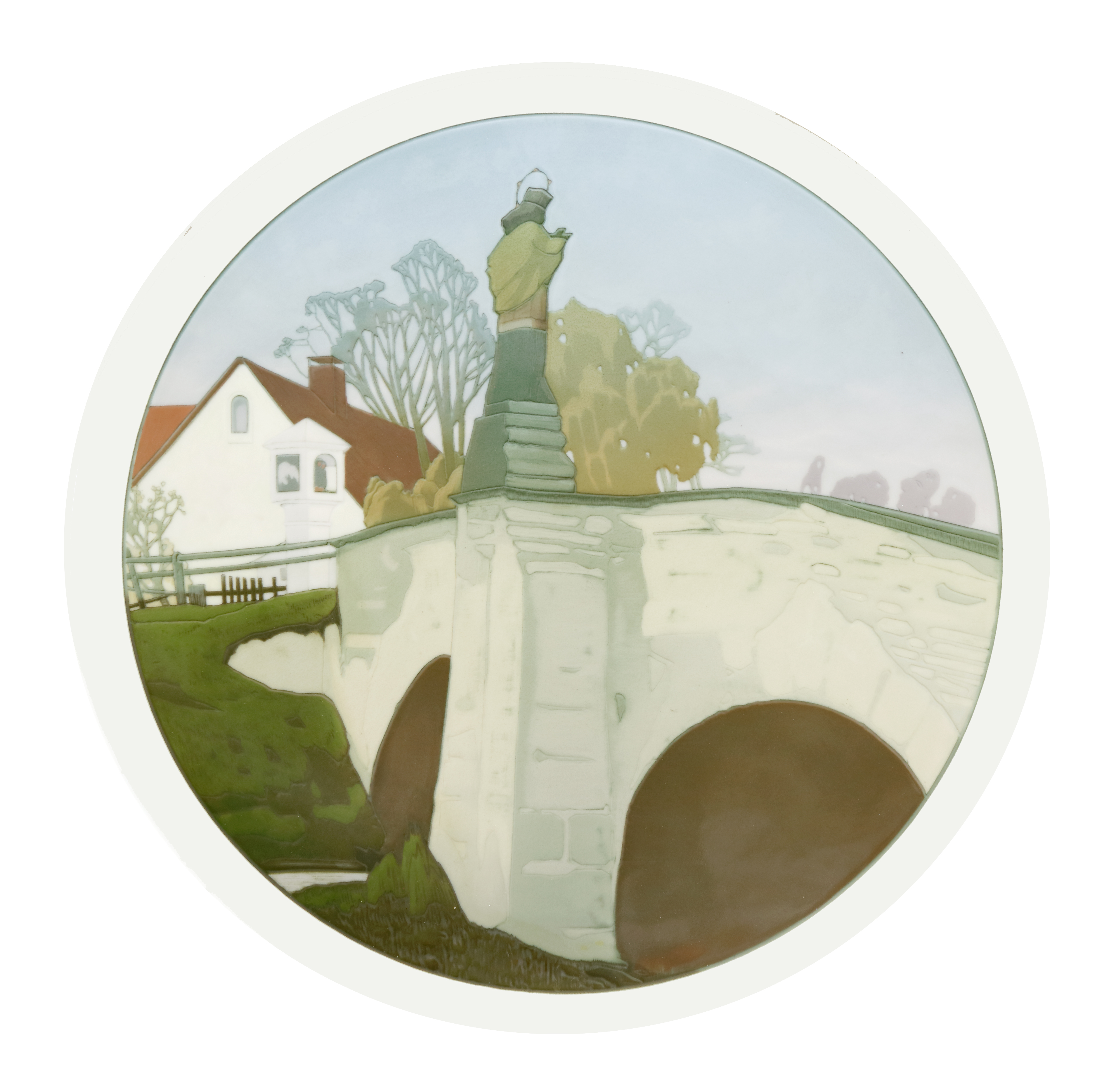 Plateau mit Ansicht der St. Nepomukbrücke bei Tag. Porzellan, farbiger Unterglasurdekor. Blaue Zeptermarke, Jahresbuchstabe IM, graviert M 15, in altrosa "A.K.", in Schwarz 300/44. D 41,4 cm. - Dekorentwurf von Franz Türcke, Februar 1909, Ausformung 1909 oder 1912, bemalt von Arthur Kloeppel. - Abgebildet in: Peter Volk, Franz Türcke (1877-1957) als Porzellanmaler an der Berliner Manufaktur. Sonderdruck aus Keramos Nr. 48, S. 67, Abb. 2, dort bez. Ansicht einer Brücke in Grüssau. (1073-1)