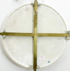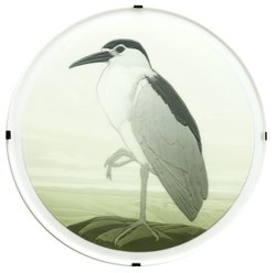 Plateau mit Reiher. Porzellan mit Unterglasurdekor in Gelbgrün und Grautönen. Links unten monogrammiert "STB". Blaue Zeptermarke und STB, darunter Schliffstrich, Modellnummer 7949, Jahresbuchstabe O, weitere Ritz- und Presszeichen. Zwei punktuelle Glasurfehler unten rechts. D 41,5 cm. Der Dekorentwurf von Theodor Schmuz-Baudiss, Juni 1905. Ausformung 1914. (1073-2)