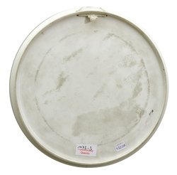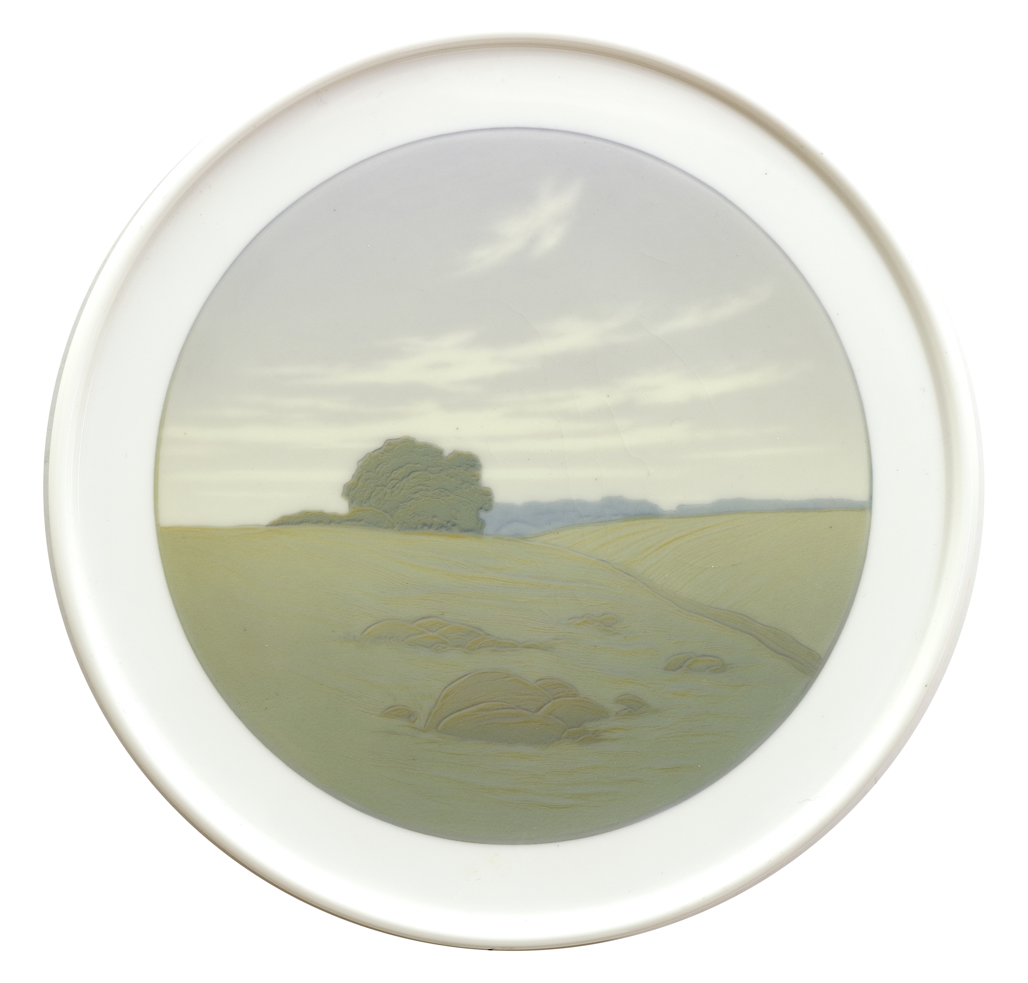 Plateau mit Wiese und Baumgruppe. Porzellan mit Unterglasurdekor in eingeschränkter Polychromie. Blaue Zeptermarke, Jahresbuchstabe I oder M, graviert M15, in Purpur 18834., in Schwarz 300/10. Glasur etwas krakeliert. D 26,2 cm. Ausformung 1909 oder 1912, der Dekorentwurf Theodor Schmuz-Baudiss zugeschrieben. (1073-3)