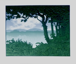 "Seeufer". Porzellan mit Unterglasurdekor in eingeschränkter Polychromie. Modell 11286. Unten rechts bezeichnet und monogrammiert "STB". Blaue Zepter- und Reichsapfelmarke, unterglasurblaues S.I., Pressmarke Zepter mit KPM, Jahresbuchstabe T, in Grau 4022 II, in Schwarz 300/392, weitere Presszeichen. Chip an der oberen hinteren rechten Ecke. H 26 cm, B 30 cm. Der Dekorentwurf von Theodor Schmuz-Baudiss, Ausformung 1919. (1073-8)