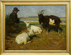 Weidende Ziegen und Hirte in Sommerlandschaft. Öl auf Leinwand. 60 x 80,5 cm. Links unten signiert. Gerahmt. (1074-1)