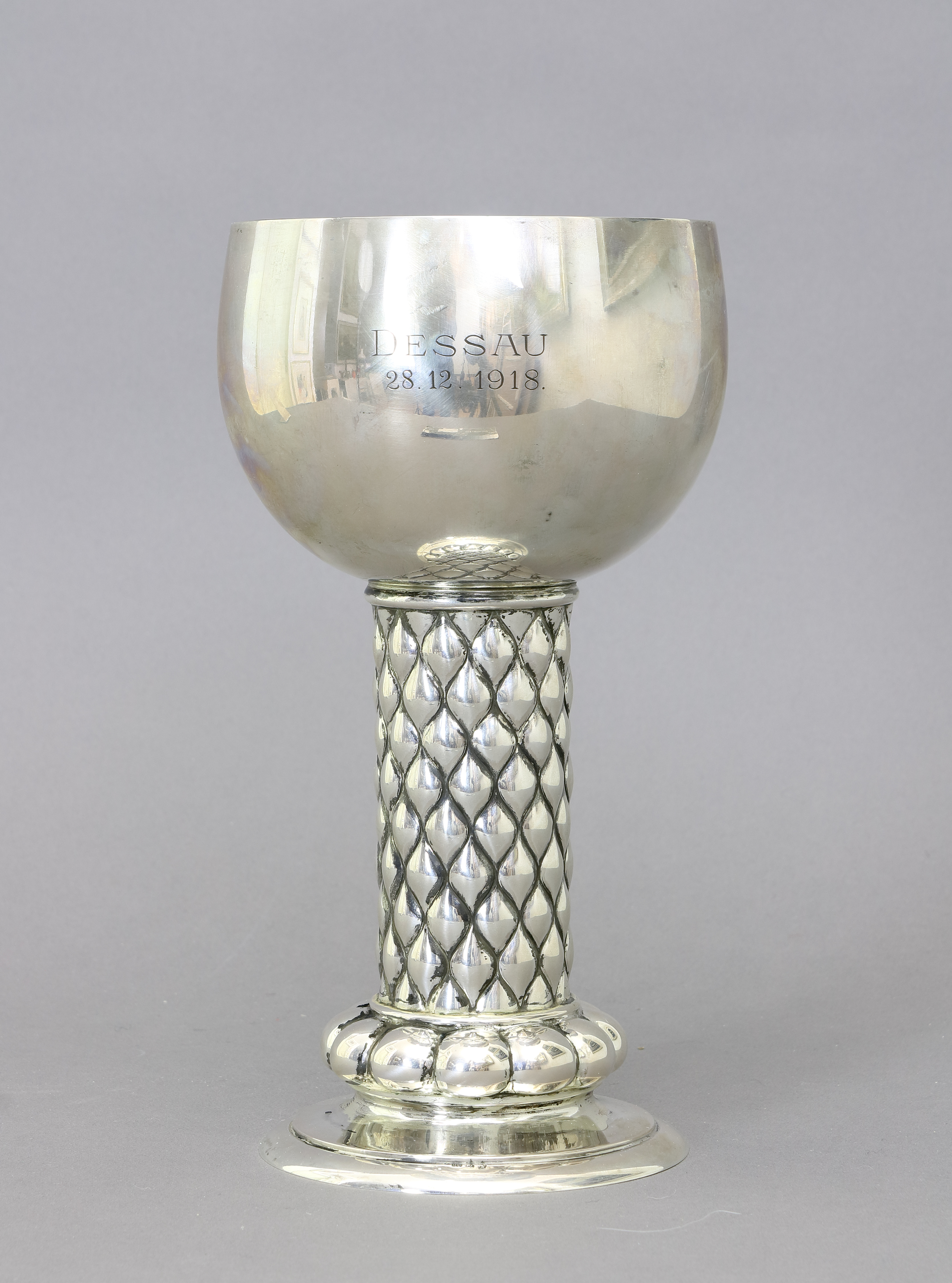 Runder profilierter Stand mit umlaufendem Buckelkranz. Runder Schaft mit erhabenem Rautenmuster. Baluster-Kelch mit Innenvergoldung und Bezeichnung "Ehrenpreis seiner Hoheit des Prinzen Aribert von Anhalt" sowie Dessau 28.12.1918. H.: 22,5 cm. Gewicht ca. 422 g. Punzen 800, Halbmond, Krone und aufsteigendes Pferd (Gebr. Kühn Schwäbisch Gmünd) - Prinz Aribert von Anhalt (18. 6. 1864 Wörlitz - 24. Dez. 1933 München) war Regent des Herzogtums Anhalt. (1088-1)