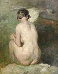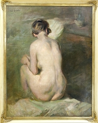 Sitzender weiblicher Rückenakt. Öl auf grober Leinwand, doubliert. 100 x 81,5 cm. Links oben signiert. Gerahmt. - Grieb war Schüler von Habermann. (1090-1)