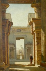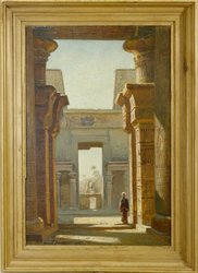 Im Tempel zu Edfu (Oberägypten), erbaut um 180 v. Christus. 1927. Öl auf Leinwand auf Malkarton. 50,5 x 34 cm. Signiert und datiert sowie rückseitig auf altem Klebeetikett bezeichnet. Gerahmt. (1092-4)