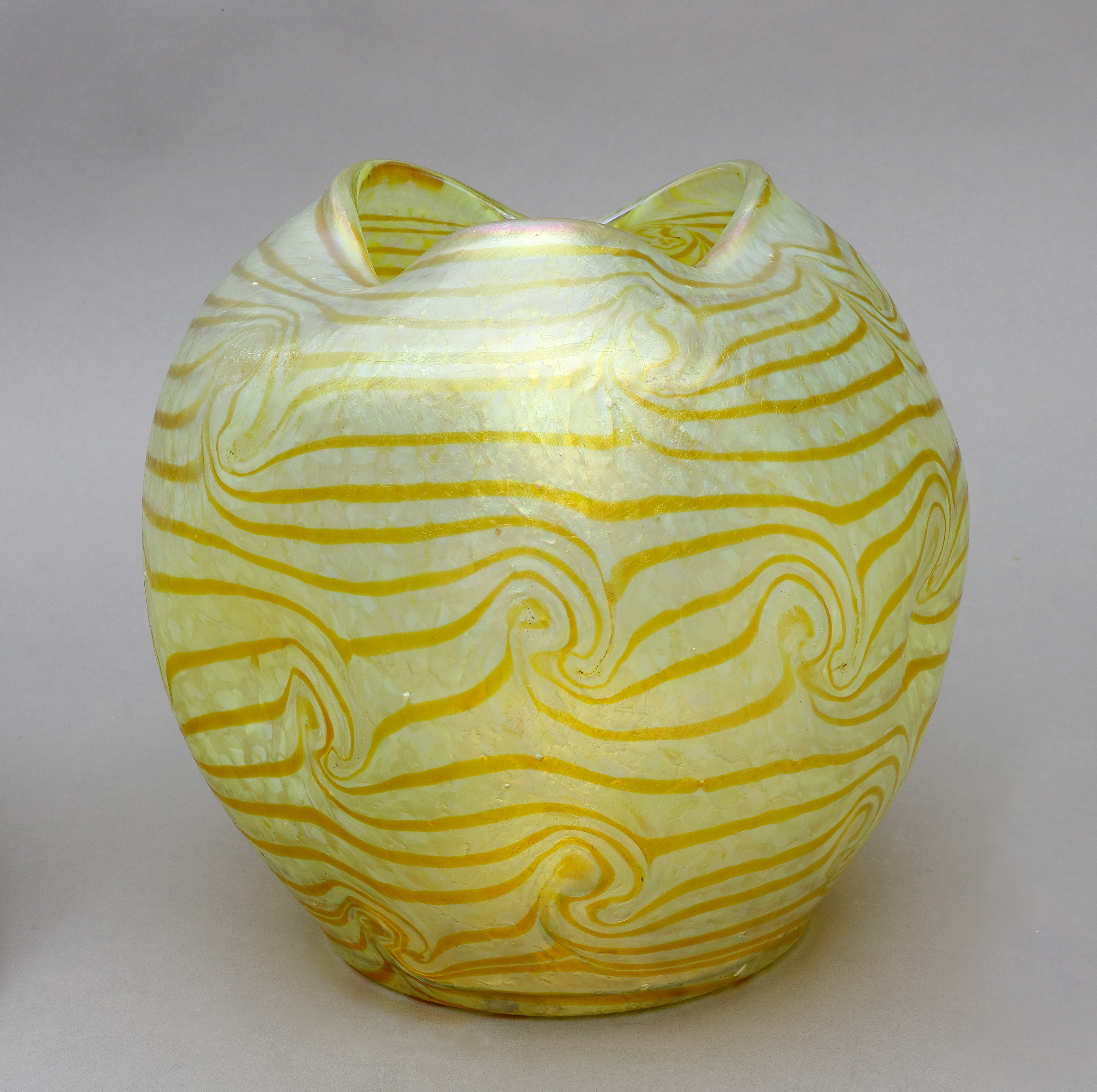 Kugelform mit dreifach eingekniffenem Rand und dreifach eingedrückter Wandung. Irisierendes Glas mit Argus - Muster (Wellen). H.: 24 cm, D.: ca. 24,5 cm. (1094-3)