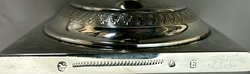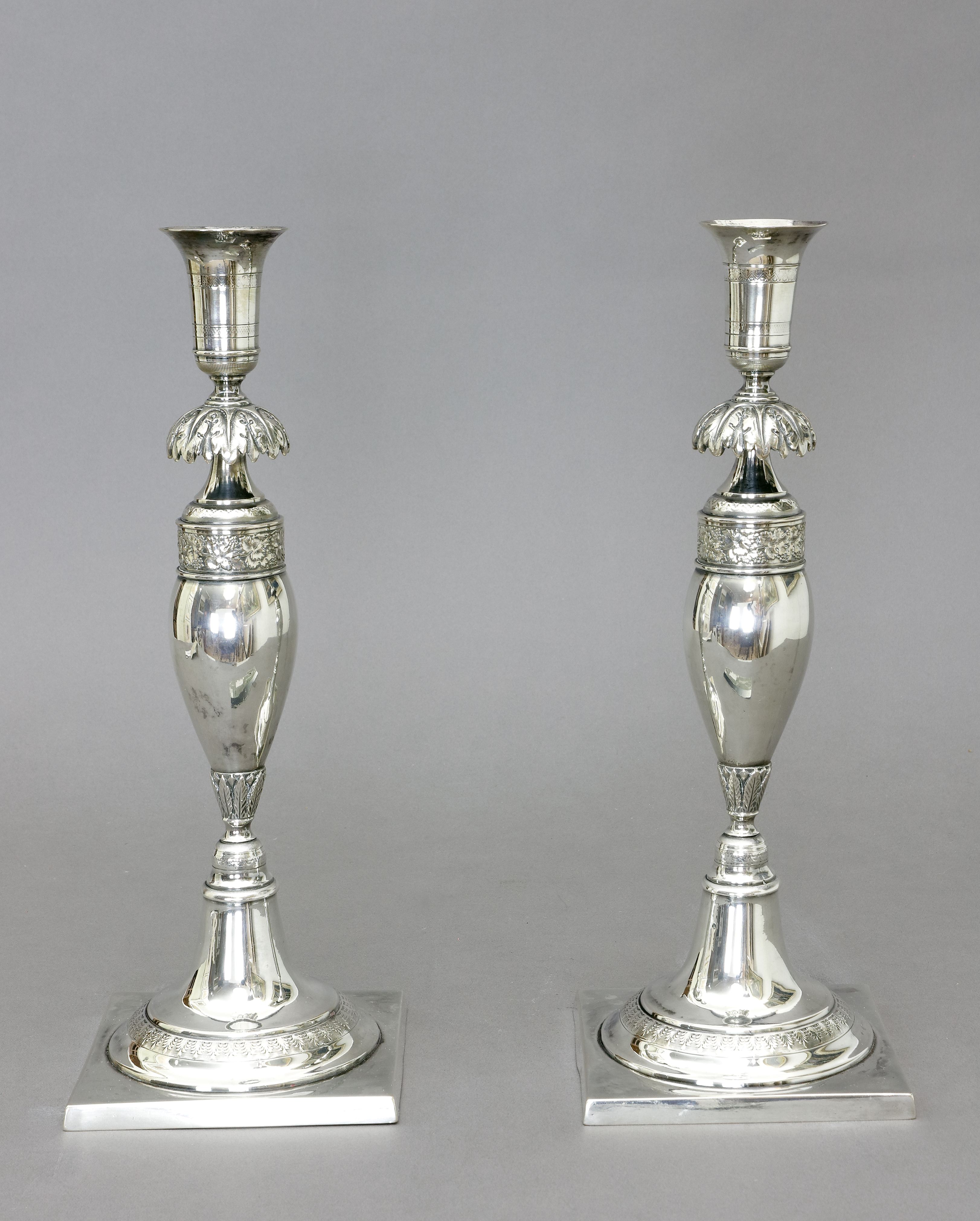Rechteckiger Stand mit rundem ansteigendem Fuß. Balusterschaft mit Akanthus und Weinblattreliefkranz. H.: ca. 28,5 cm. Gewicht zus. ca. 677 g. Marken: Tremolierstrich, Berliner Bär mit "K" 1821-1850 sowie "A" im Rund. Beschau des zweiten Zeichenmeisters B.G.F. Andreack 1821 - 1841 sowie "F" im Rechteck für Friedrich Fournier ? (verstorben am 1.6.1832). - Vgl. Scheffler. Zusätzlich gepunktetes, wohl Eigentümer Monogramm "DT" ?  (1095-1)