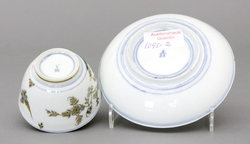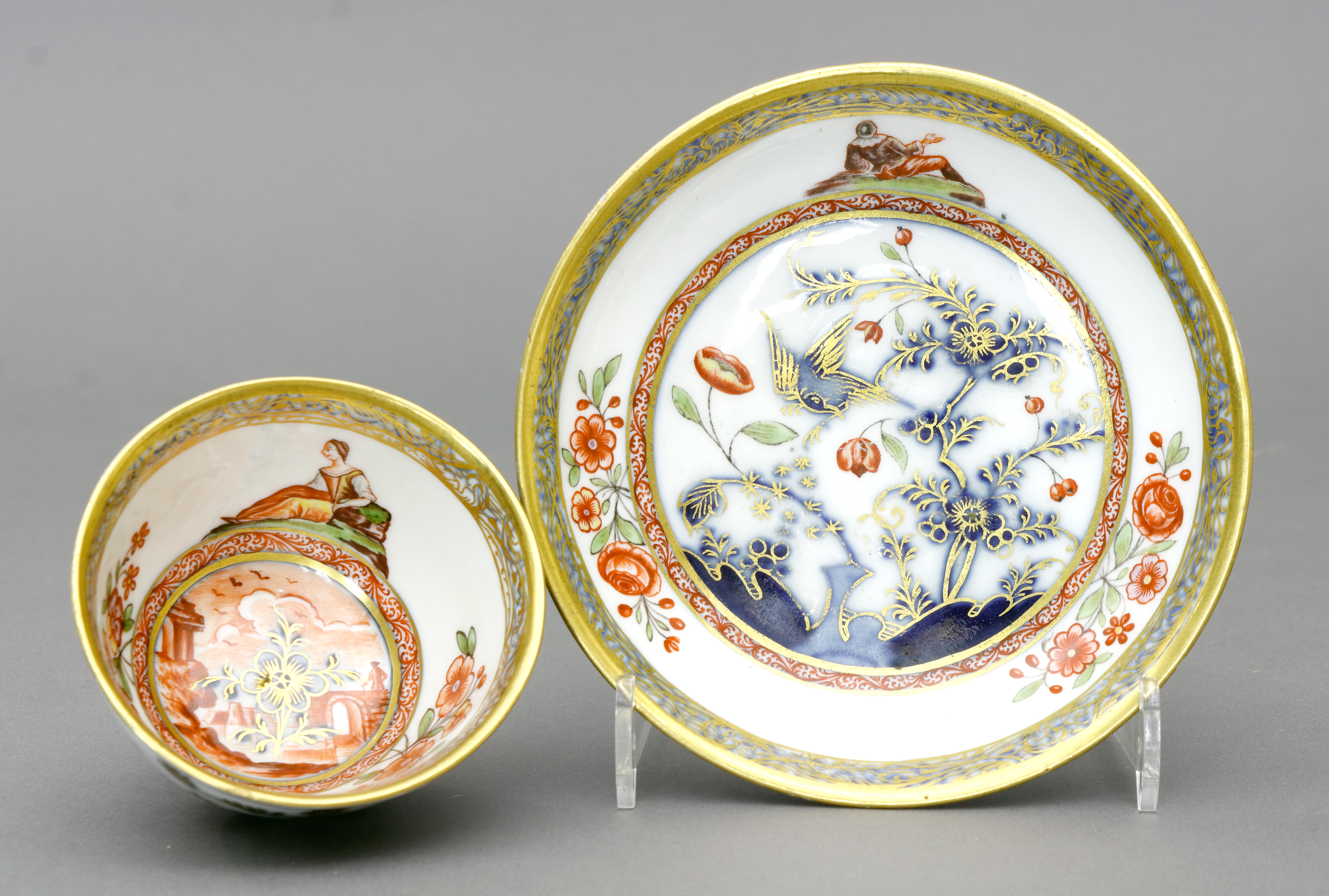 Auf der Innenwandung bunte figurale und florale Malerei, Boden mit Landschaftsmotiv, außen vergoldete Blaumalerei (Fels- und Vogeldekor). Passende Untertasse. Beide Teile mit blauem Doppelring und Schwertern. - Vgl. Rainer Rückert, S. 128, N° 566, Tafel 139. (1095-2)