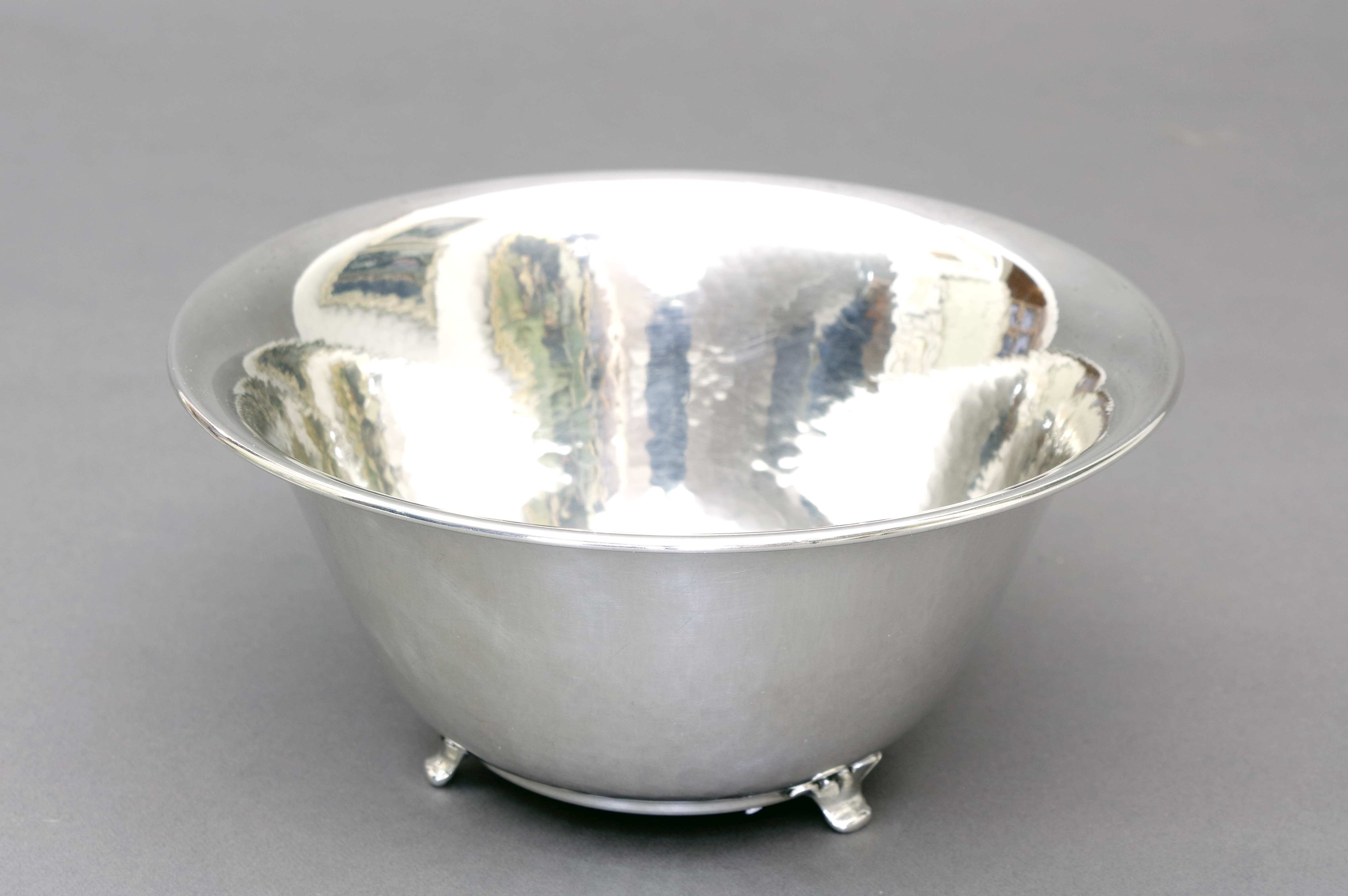 Rund. Konische Wandung, tief gemuldet, Innen martelliert, auf drei Füssen. H.: 7 cm, D.: 15, Gewicht ca. 116 g. (1095-3)