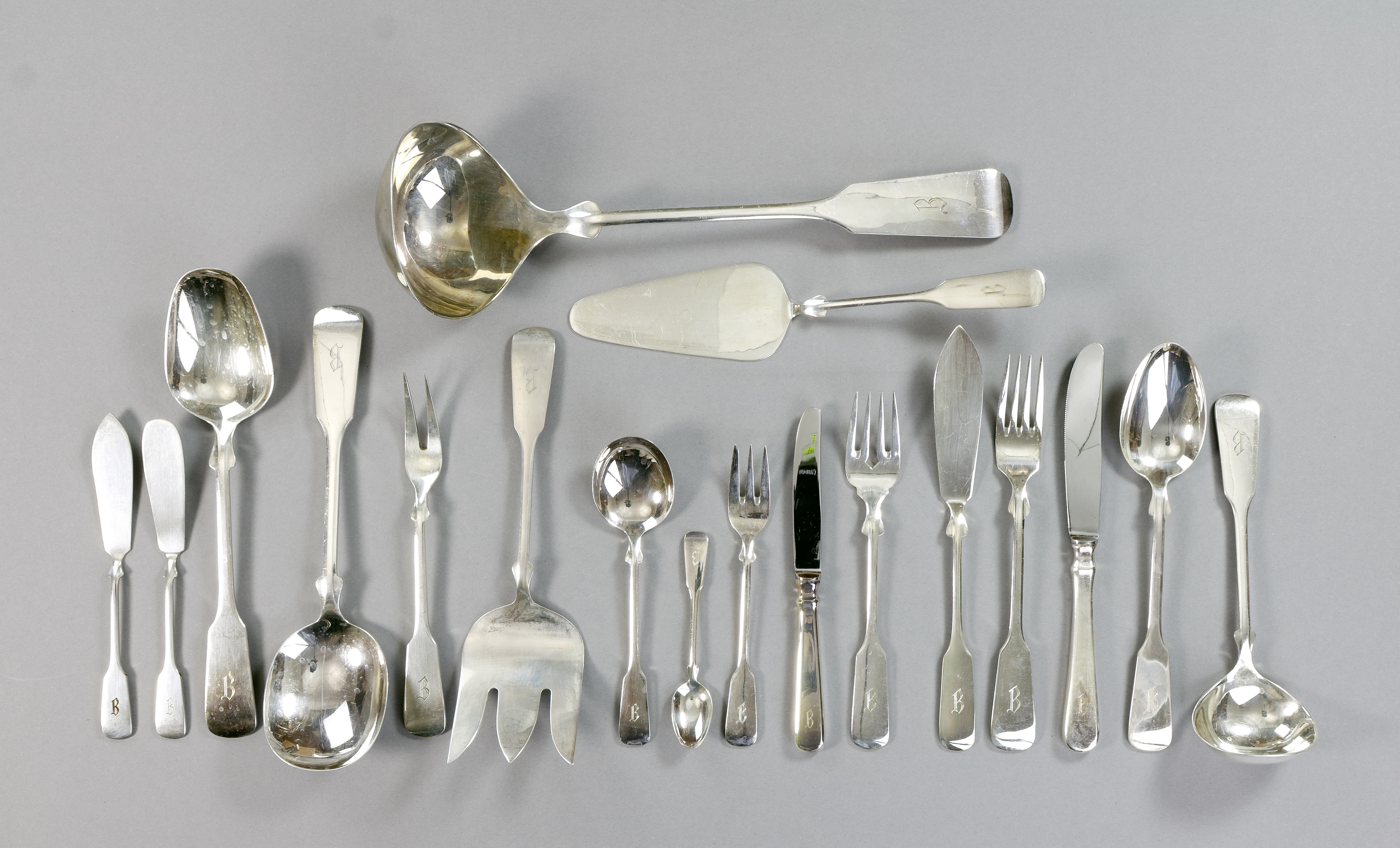 Teile Spatenmuster. Monogrammiert "B". Bestehend aus 12 und 12 Messern, 12 und 12 Gabeln, 12 und 12 Löffeln, 12 x Fischbesteck, 12 Kuchengabeln, 11 Kaffeelöffeln, 6 Moccalöffeln, Sosenkelle, Kelle, Tortenheber, Butter- u. Käsemesser, Vorlegemesser, zwei Vorlegelöffeln und 2-2 -gabeln, Zuckerzange, Zuckerlöffel, 1+1 Heber. Gewicht zus. ca. 5370 g (Messer mit 10 g berechnet). Punzen Halbmond, Krone, 800 und R&B.  (1096-3)