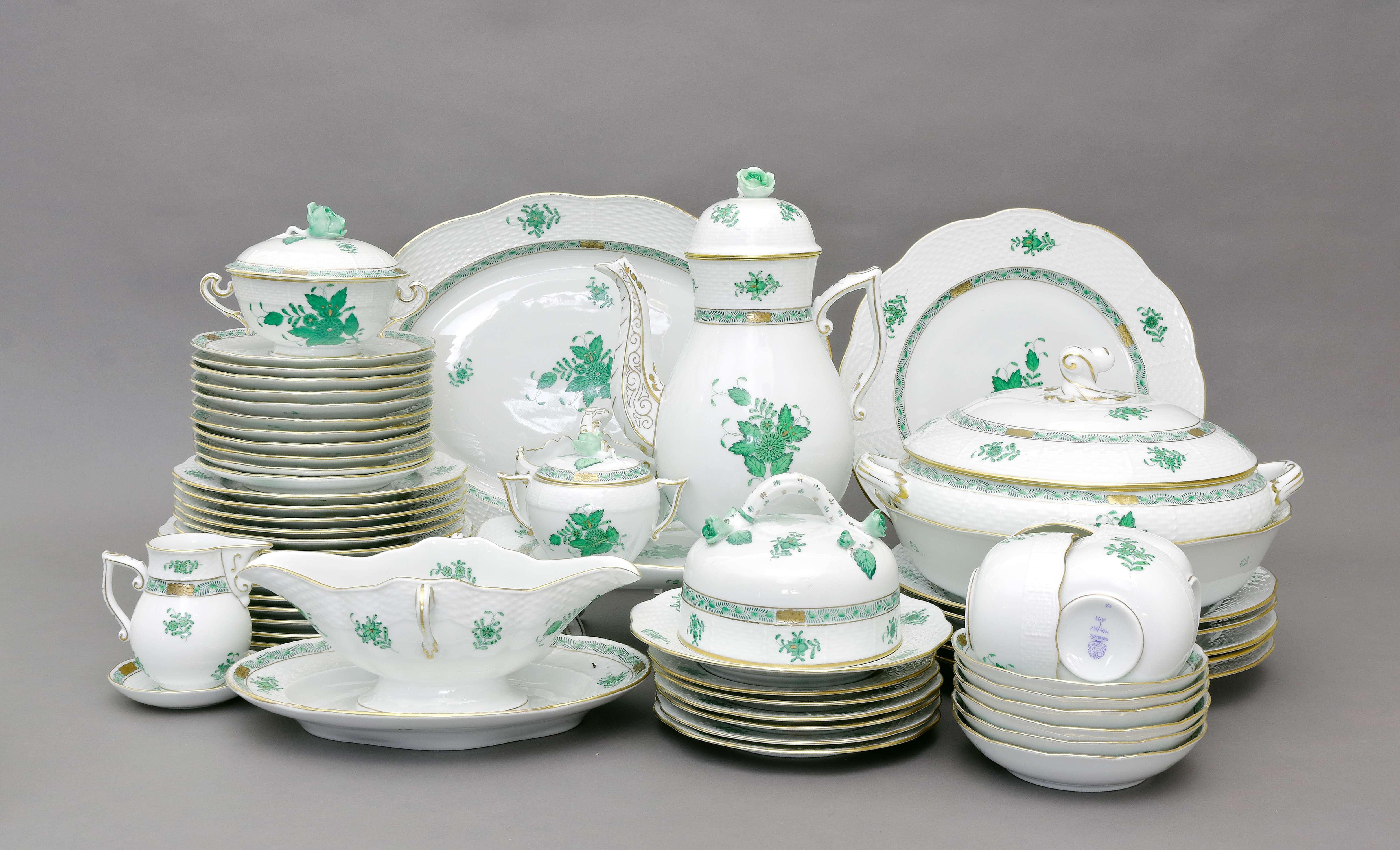 Apponyi grün. Bestehend aus 11 Speisetellern (D 25,5 cm), runder Fußplatte (D 28 cm), Deckelterrine, zwei und zwei Gemüseschüsseln, ovaler Platte (36,5 x 28 cm), Sauciere, 11 Suppentassen mit 11 Untertassen, Kaffeekanne, Milchkännchen mit kl. Unterteller, Zuckerdose, kl. Henkelkorb, 6 Tassen mit 6 UT, 6 Tellern (D 16,5 cm), 6 Tellern (D 19 cm), 8 Tellern (D 20,5 cm), 6 Dessertschalen und ovaler Platte auf vier Füßen (26,5 x 20 cm. Blaue Manufakturmarke. (1096-7)