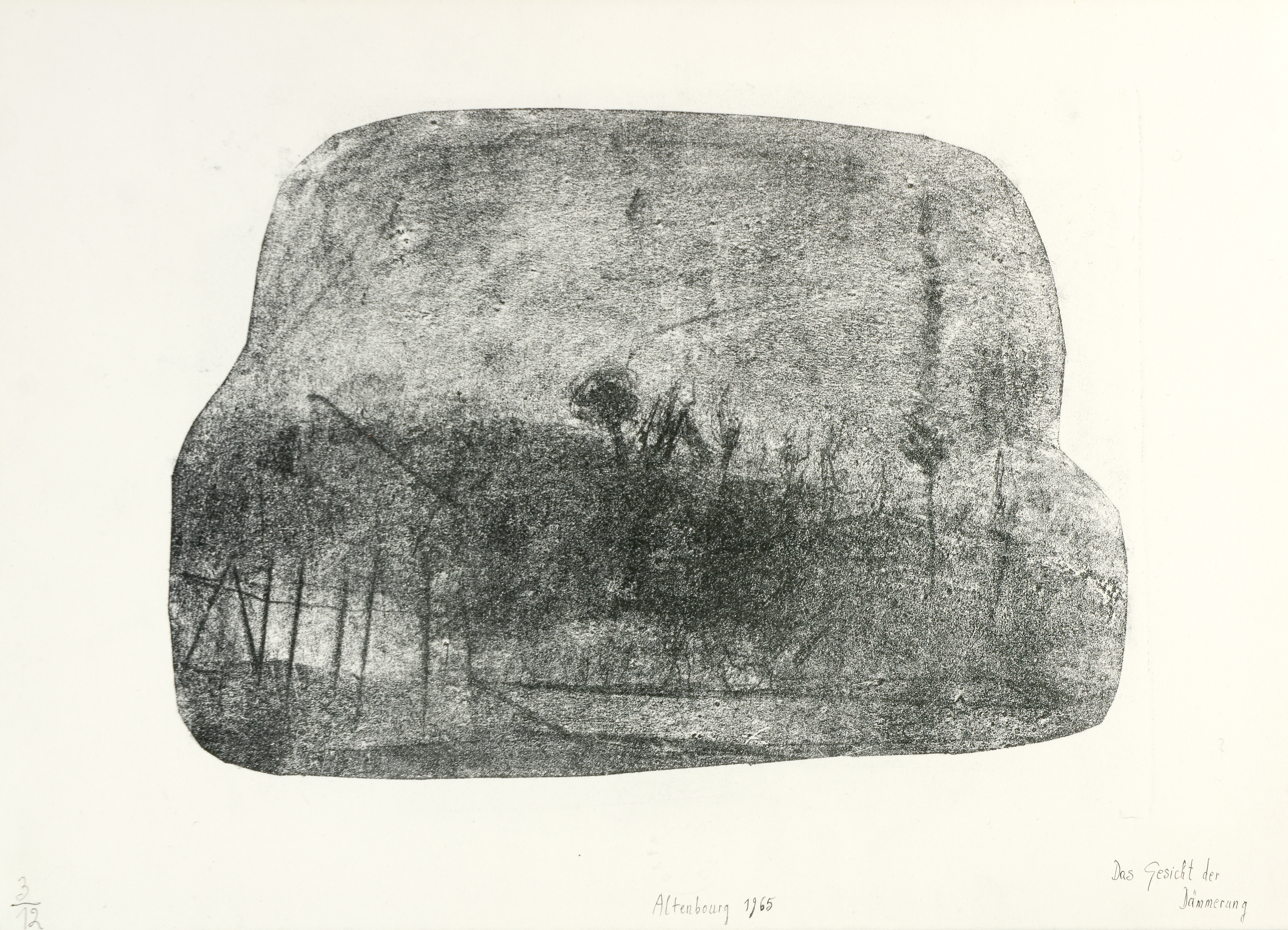 Das Gesicht der Dämmerung. 1965. Lithographie auf Velin. 19,6 x 28,2 cm, Bg. 27,5 x 38,3 cm. Am unteren Rand signiert, datiert, bezeichnet und nummeriert. Exemplar 3/12. Mit dem Altenbourg-Trockenstempel. - Janda L 99. (1098-3)