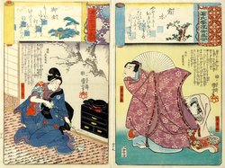 Aus der Serie "Genji Kumo". Ukiyo - e Awase. Ukiyo - e Parallelen zu den Kapiteln der Geschichte des Prinzen Genji. 14 Farbholzschnitte auf Japan. Ôban-tat -e. Verleger: Ise - ya - Ichiei. Erschienen 1840-45. Auf den Blättern befindet sich zum Teil der Kiri-Stempel unter der Signatur von Kuniyoschi. (1098-32)