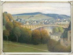 Ansicht von Alt Plauen im Vogtland mit der König-Friedrich-August-Brücke (heute Friedensbrücke), mit Straßenbahn und zahlreichen Passanten. Um 1910. Öl auf Leinwand. 65,4 x 88,4 cm. Links unten signiert. Gerahmt. (1098-7)