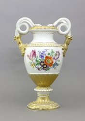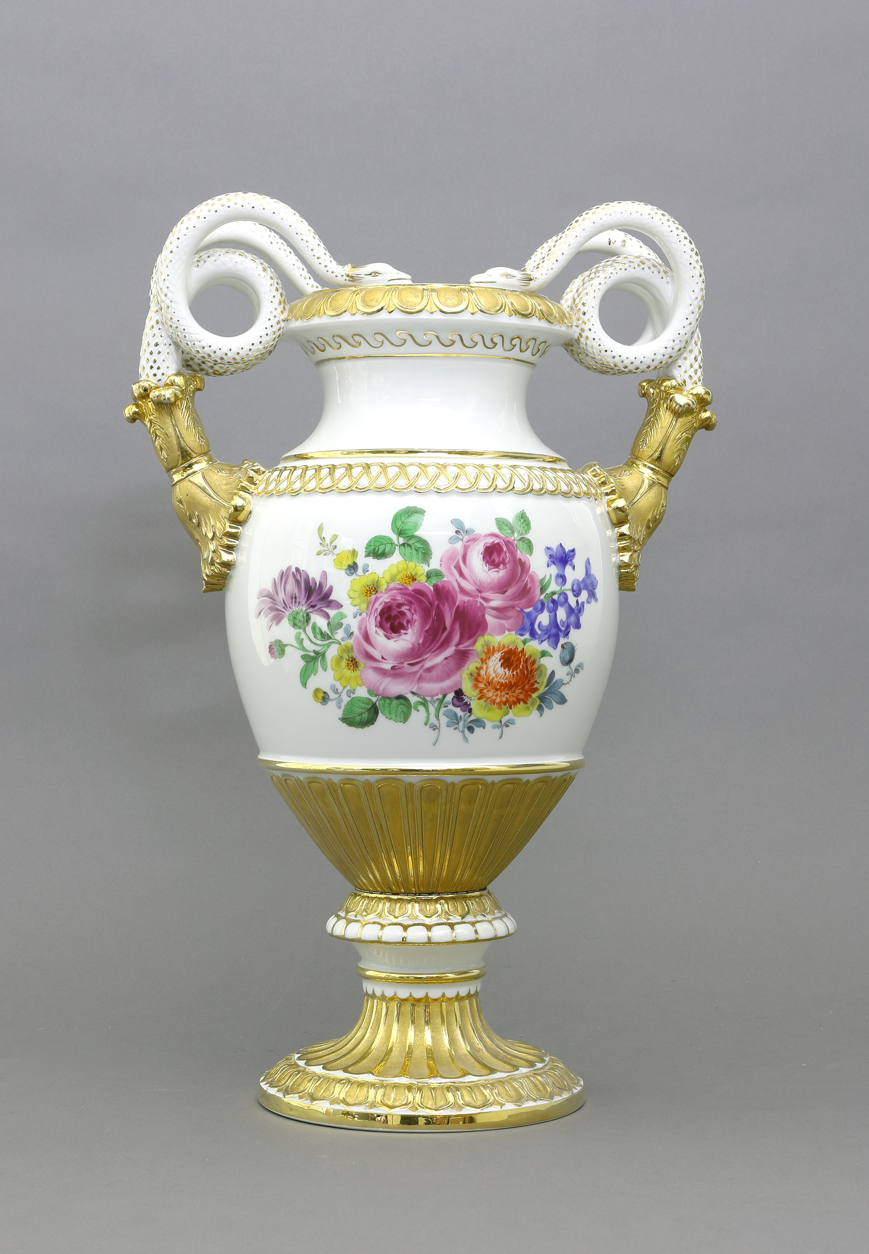 Doppel-Schlangenhenkel. Entwurf Ernst August Leuteritz (1818 Meissen - 1886 ebd.). Balusterform mit reichem Goldreliefdekor. Schau- und Rückseite bunt gemalt mit Blumenbouquets. H.: 38,5 cm. Blaue Schwertermarke, 1. Wahl. Tadellos erhalten. (1099-1)
