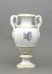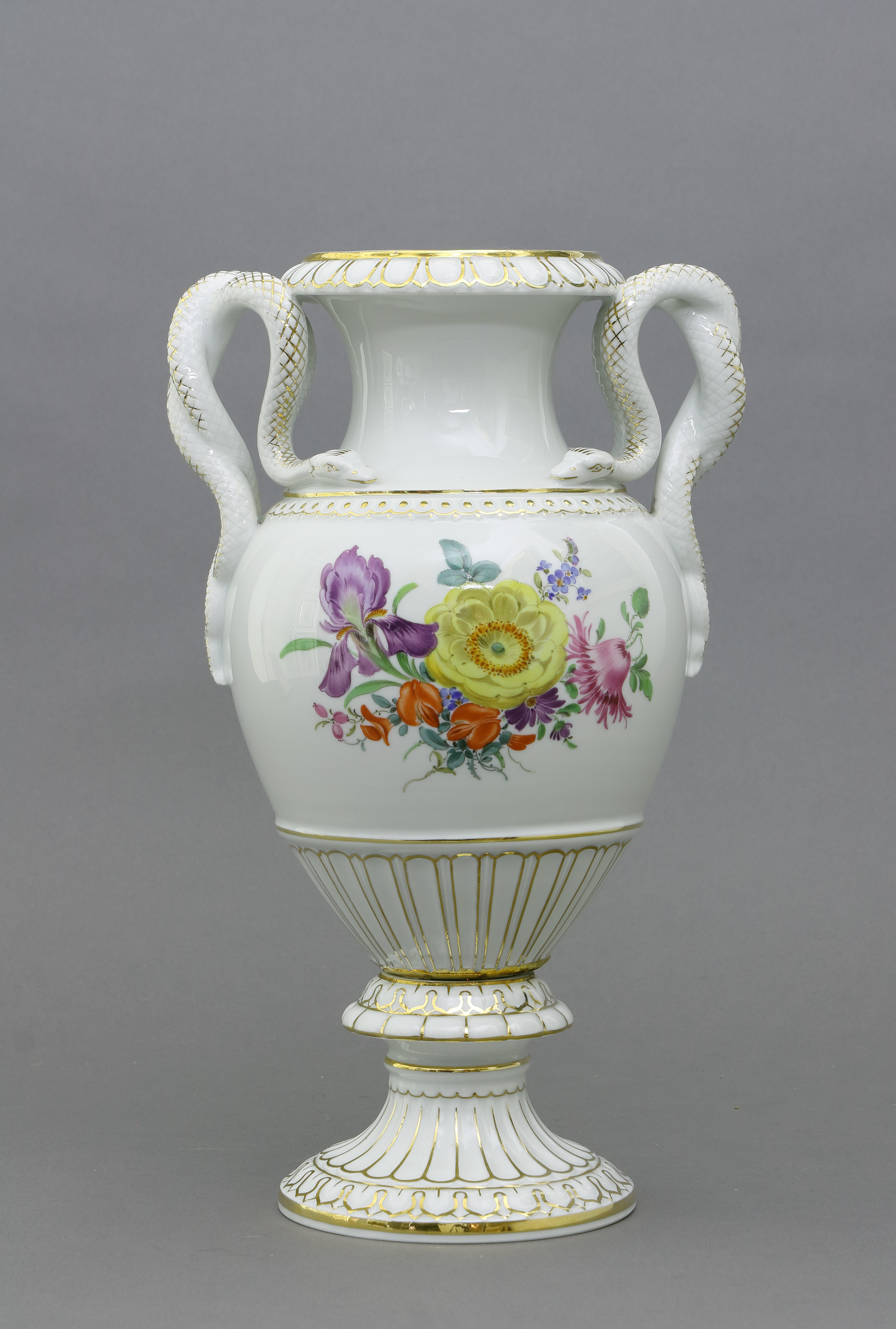 Doppel-Schlangenhenkel. Entwurf Ernst August Leuteritz (1818 Meissen - 1893 ebd.). Balusterform mit bunt gemalten Blumensträußen. Kannelierter, trichterförmiger Standfuß. Goldstaffage und Goldränder. H.: 27 cm. Blaue Schwertermarke und Modellnummer E 153 sowie Preßnummer 6108. (1099-2)