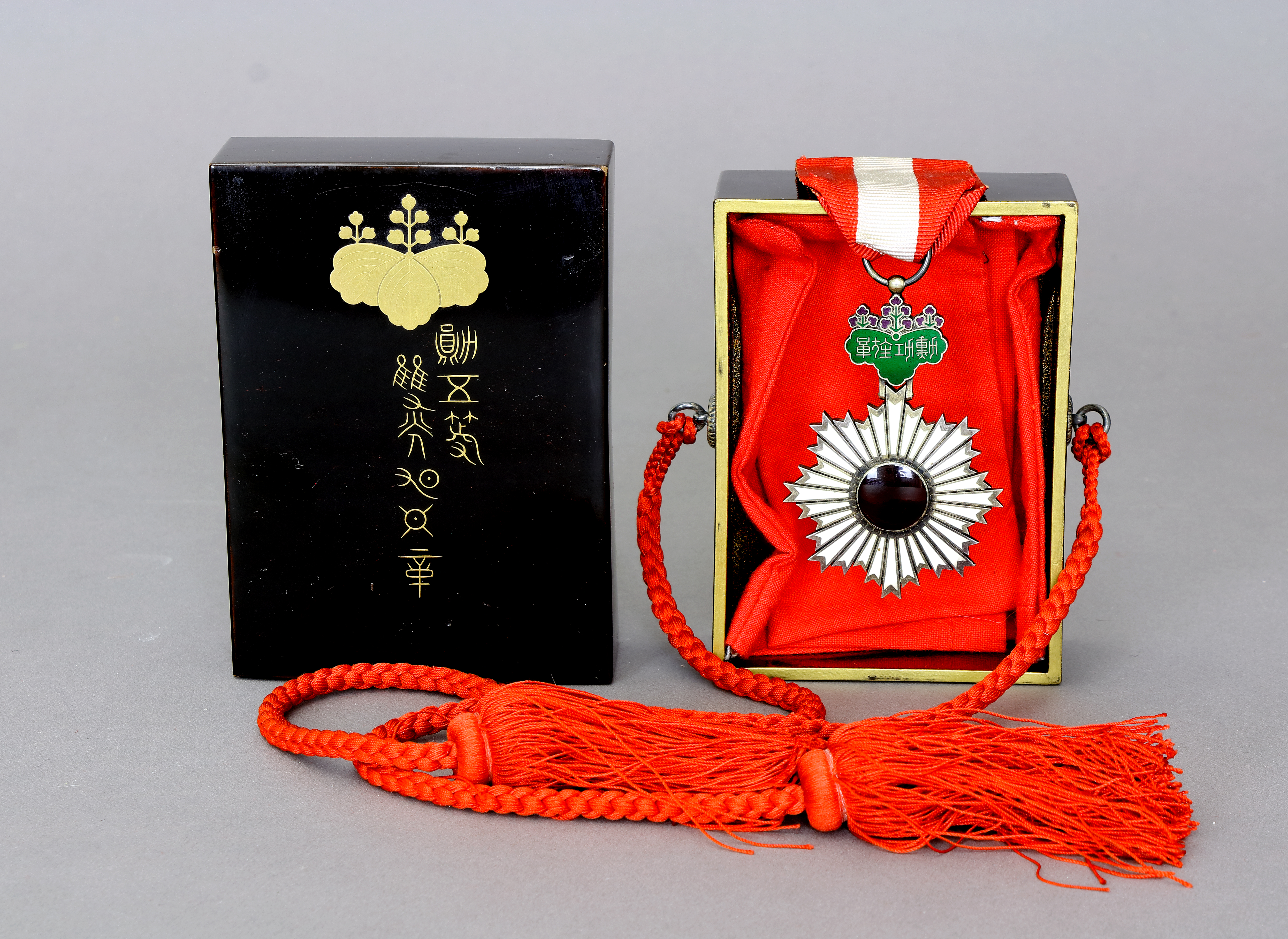 Dieser Orden wurde an besonders sich verdient gemachte Personen, Ausländer oder Japaner, durch den Meiji - Kaiser verliehen. Es war einer der ersten und höchsten staatlichen Orden. Im dekorativem, schwarzem Lacketui mit Goldzeichen, innen mit aufgestreutem Goldpuder (Maki-e) ca. 3,2 x 8 x 11 cm. (1100-3)