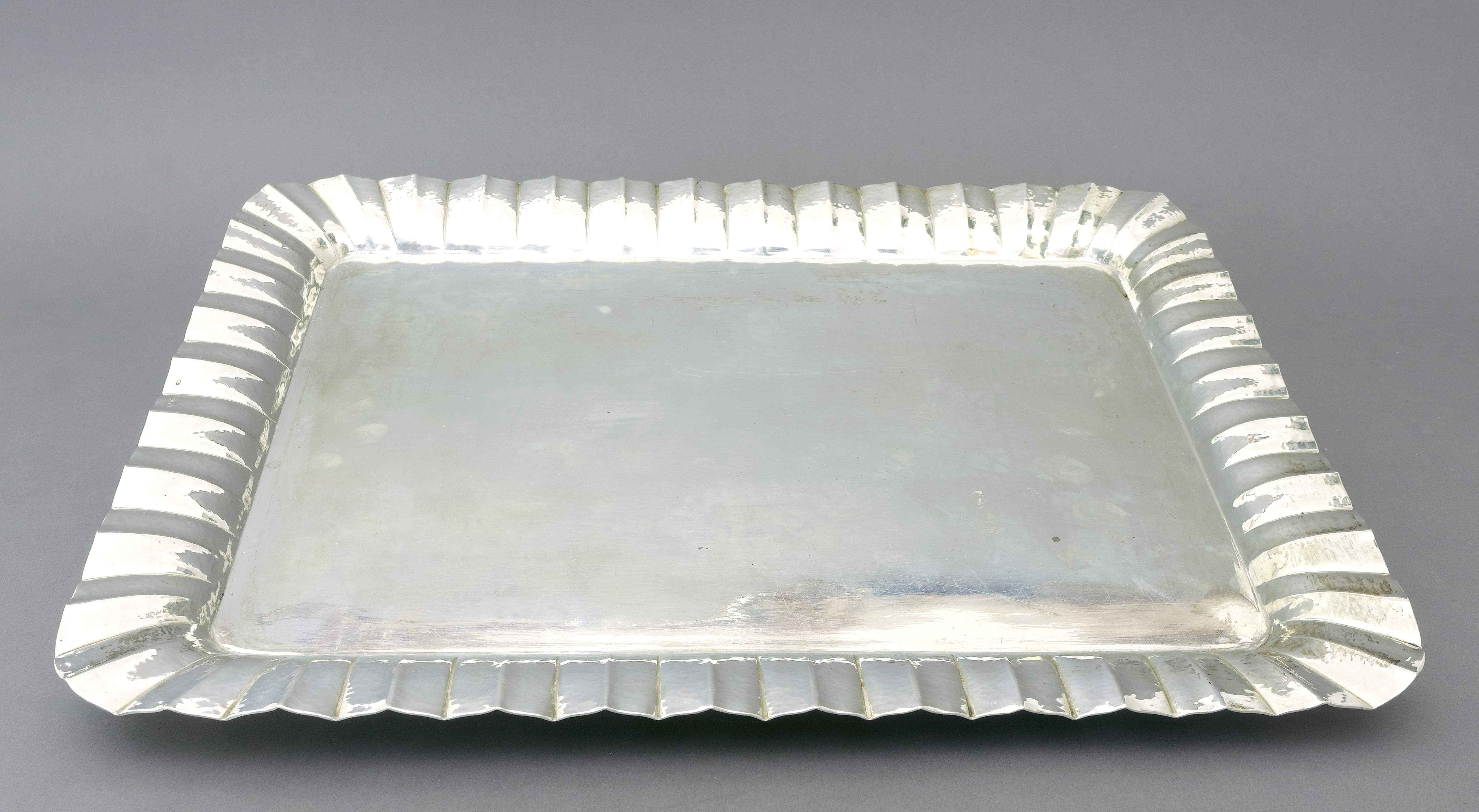 Rechteckige Form mit gerundeten Ecken. Profiliertes, marteliertes, schräges Steigbord. Ca. 39,2 x 29,1 cm. Gewicht 1152 g. Punzen: vierblättriges Kleeblatt (Silbermanufaktur A. Sturm), Tukan Punze mit 4 für 800 sowie Exportmarke. Gebrauchsspuren. (1103-1)