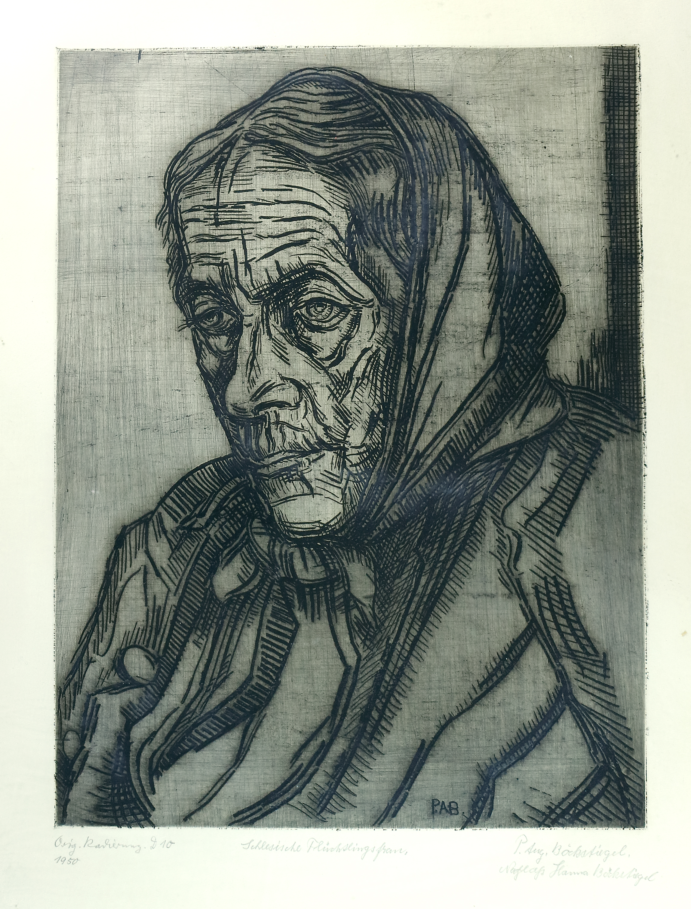 Schlesische Flüchtlingsfrau. 1950. Radierung, Ätzung auf Zink. 50 x 37,2 cm. In der Platte monogrammiert P.A.B. Von der Ehefrau Hanna Böckstiegel posthum signiert und bezeichnet. - WVZ 207. - Selten. (1104-2)