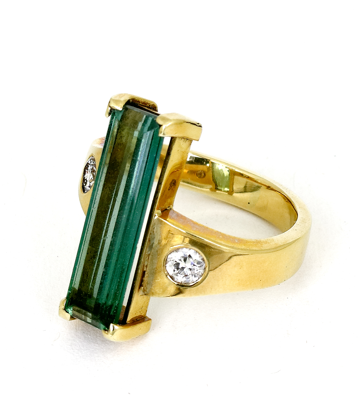 im Treppenschliff und zwei kleinen Diamanten im Brillant- Schliff. RW 55. Bruttogewicht ca. 10,33 g. (1106-5)