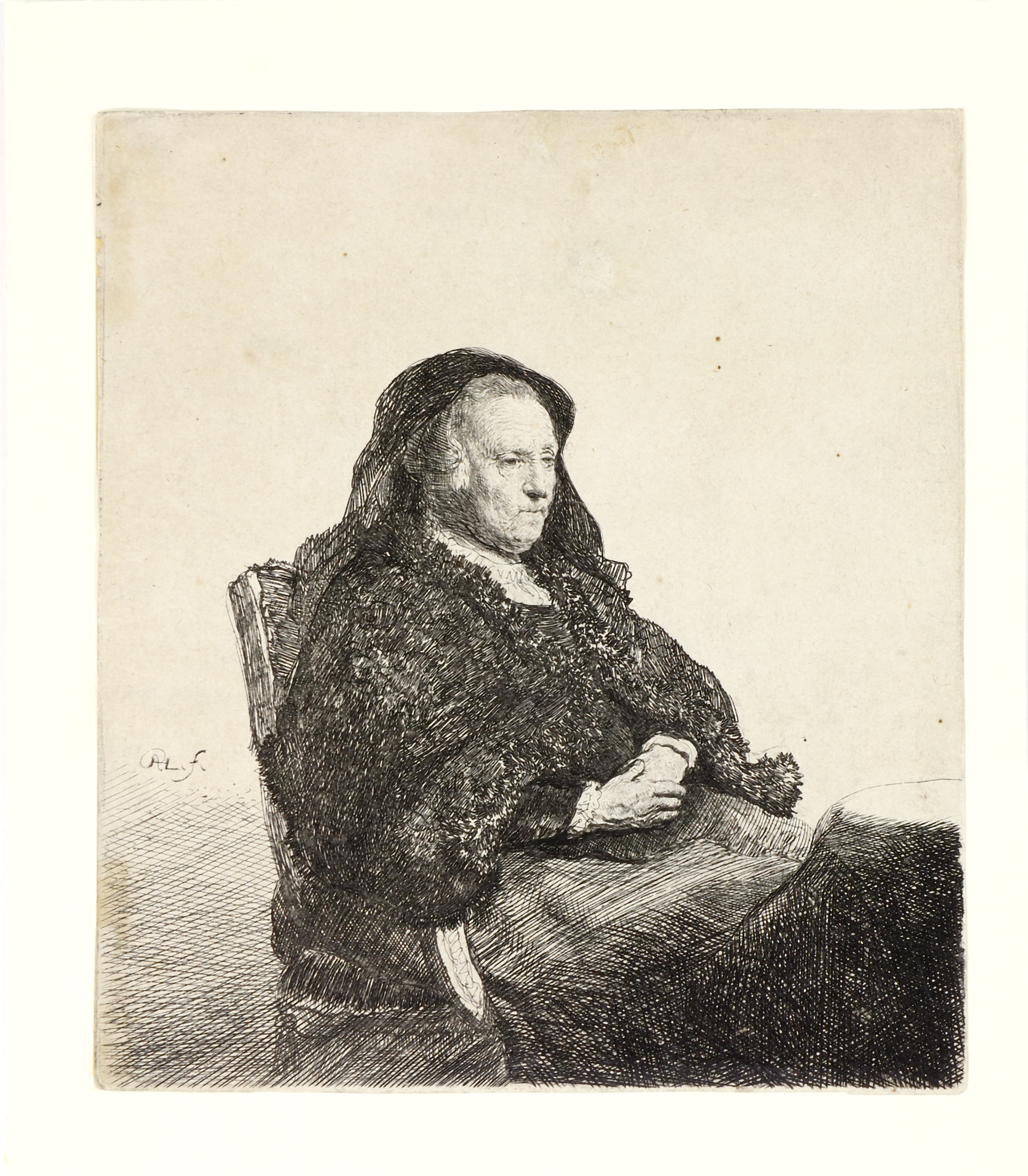 Rembrandts Mutter, am Tisch sitzend, nach rechts blickend. (Um 1631). Radierung auf Bütten, Watermark: Part of Strasbourg bend. 14,9 x 13,1 cm. In der Platte monogrammiert. - Bartsch 343 II (III), White-Boon 343, New Hollstein 91.  (1108-2)