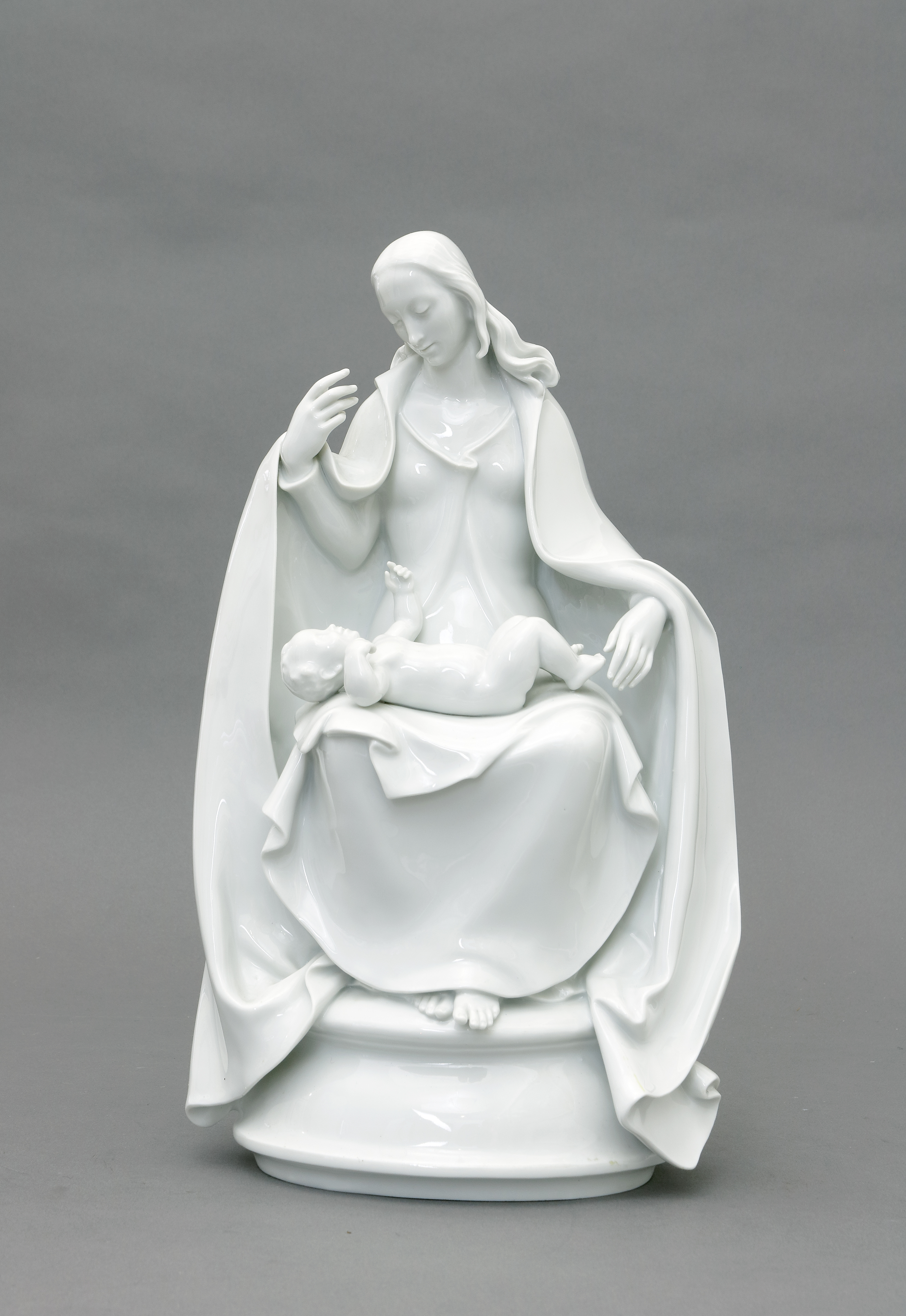 Madonna mit Kind. Entwurf Ludwig Nick (1873 Münster - 1936 Jena) nach 1912. Porzellan, weiß. H 31,5 cm. Blaue Schwertermarke, II gestrichen. Gepreßte Modelln° 72905. Tadellos erhalten. (1109-1)