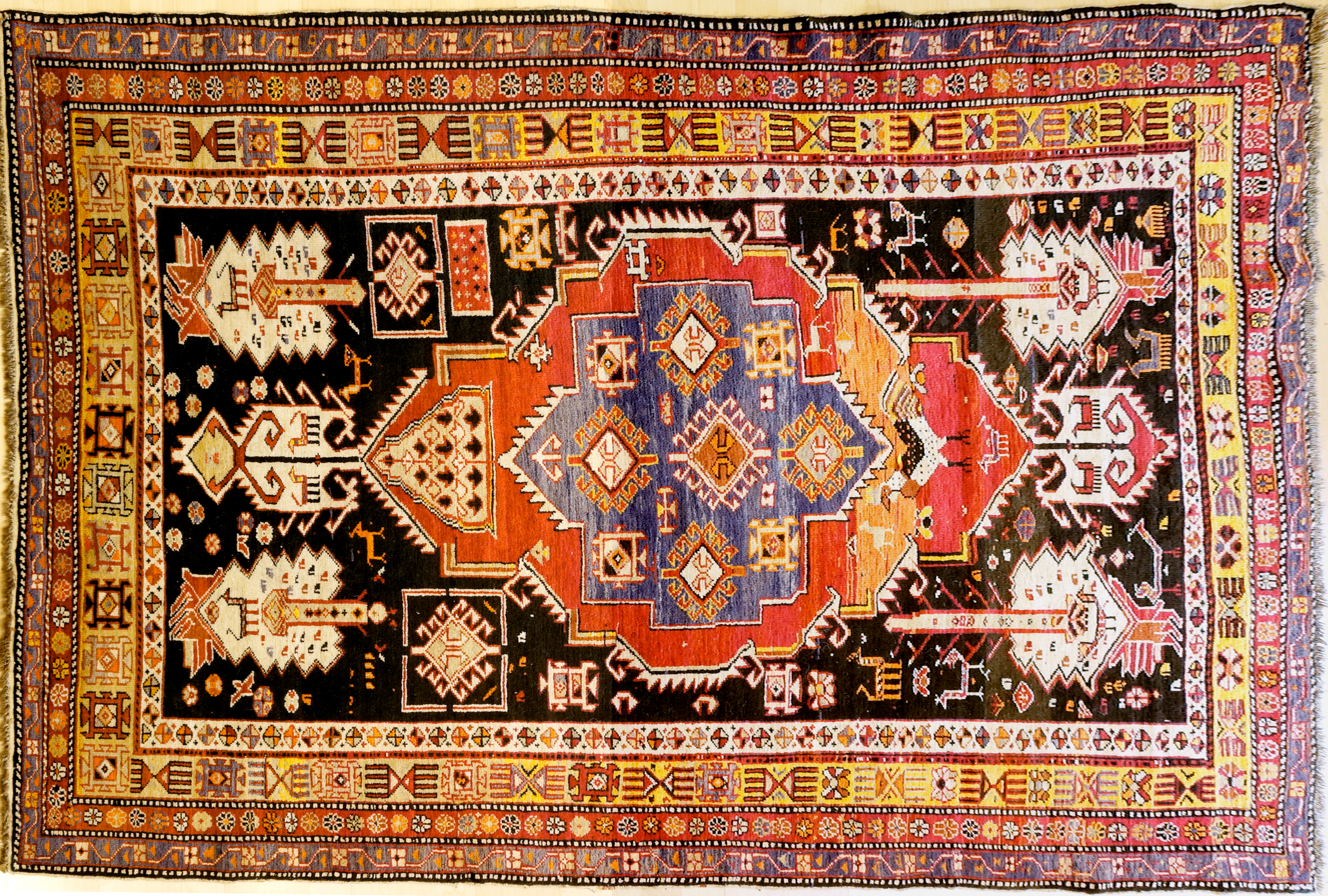 Florale Bordüren rahmen das rechteckige Mittelfeld mit einem Medaillon ein. Durchgemustert mit Phantasiemuster und stilisierten Tieren und Pflanzen. 198 x 130 cm. Sehr guter Zustand. (1110-2)