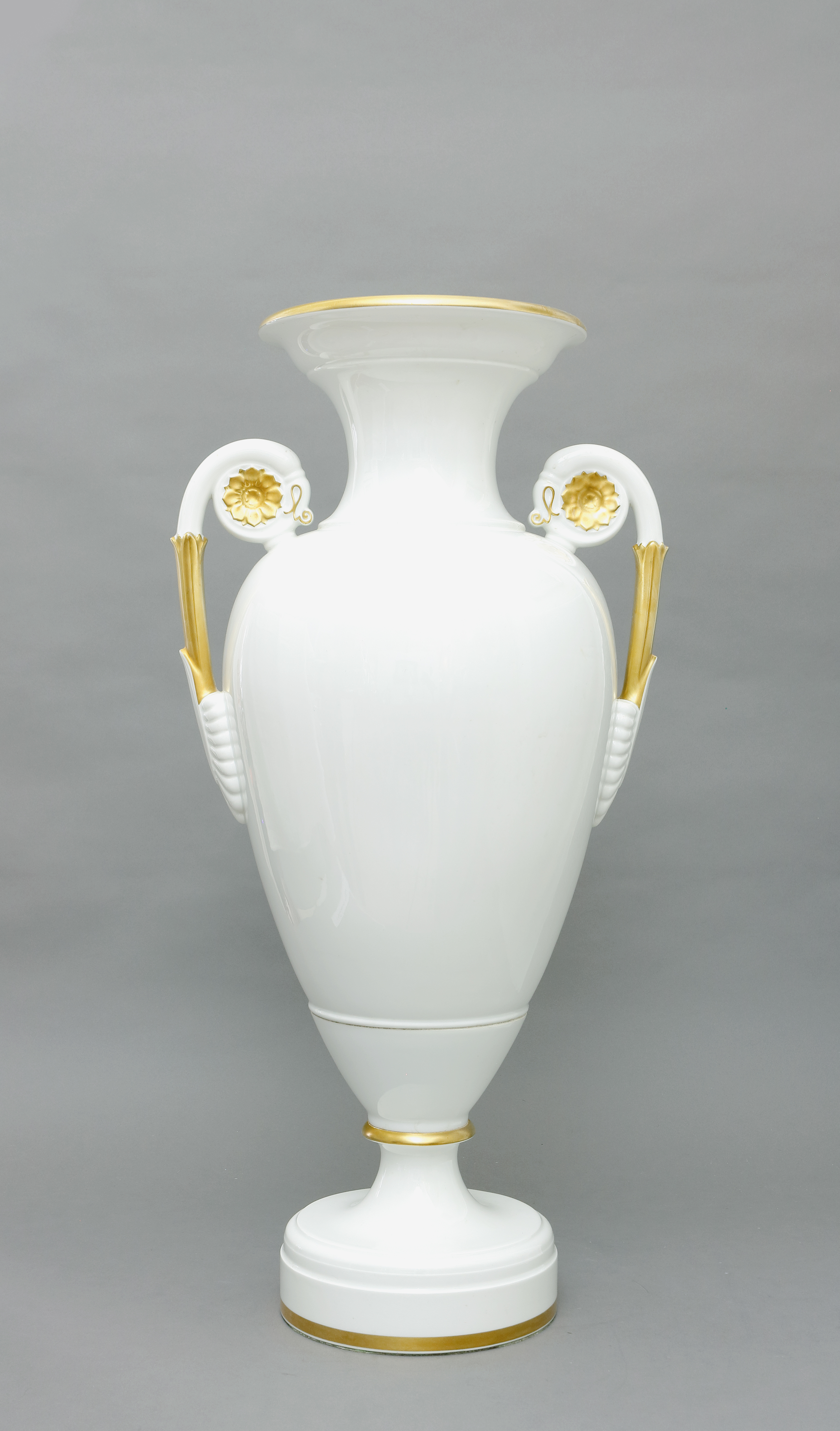 Vase nach dem Vorbild einer griechischen Amphore, mit Rosettenhenkeln, nach Karl-Friedrich Schinkel 1820-30. Mit Goldstaffage und Einsatz. H 69 cm. Blaue Zeptermarke, 1. Wahl, und Goldmalermarke. (1111-11)