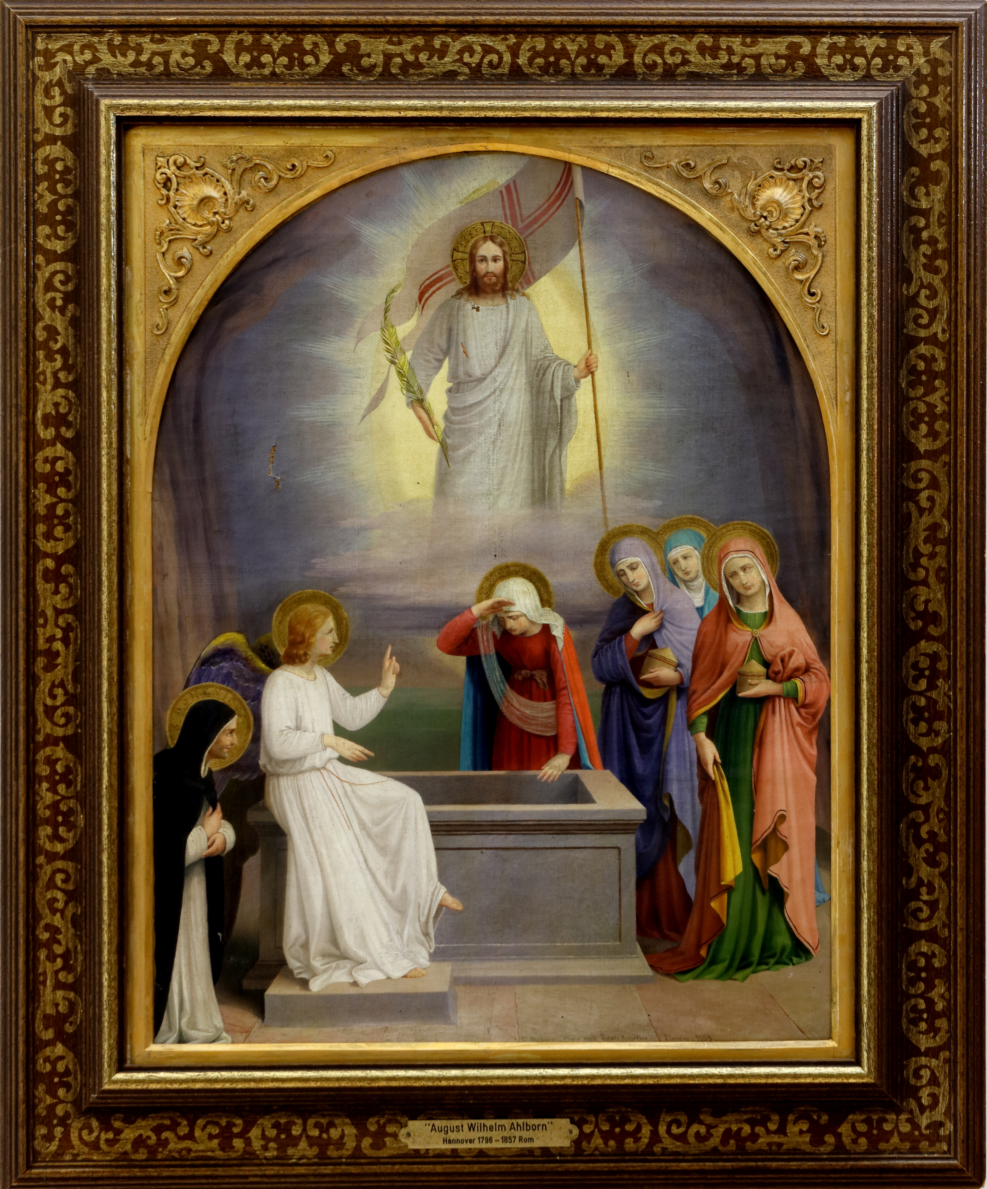 Die Auferstehung Christi und die frommen Frauen am Grab, Kopie nach Fra Angelico. Florenz 1893. Öl auf Leinwand. 49 x 38 cm. Am unteren Rand signiert, datiert und bezeichnet. Gerahmt. Leichter Restaurierungsbedarf, 2-3 kl. Fehlstellen. (1111-3)