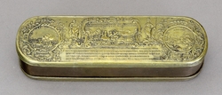 Signiert. Messing, Kupfer. Länglich, abgerundete Rechteckform mit Profilrändern und geprägtem Reliefdekor. Deckel mit Friedrich der Große im Profil (innerhalb eines Kreismedaillons). Seitlich, holländische Inschriften mit mythologischen Figuren. Rückseite mit Siegesnachricht von der Schlacht bei Prag am 6. Mai 1757. In runden Medaillons rechts und links Kriegsdarstellungen von Reichenberg und Prag. L 126,5 cm. - Vgl. Ernst Dossmann, Iserlohner Tabakdosen erzählen, Iserlohn, 1981. S.61, Abb. 41. (1114-5)