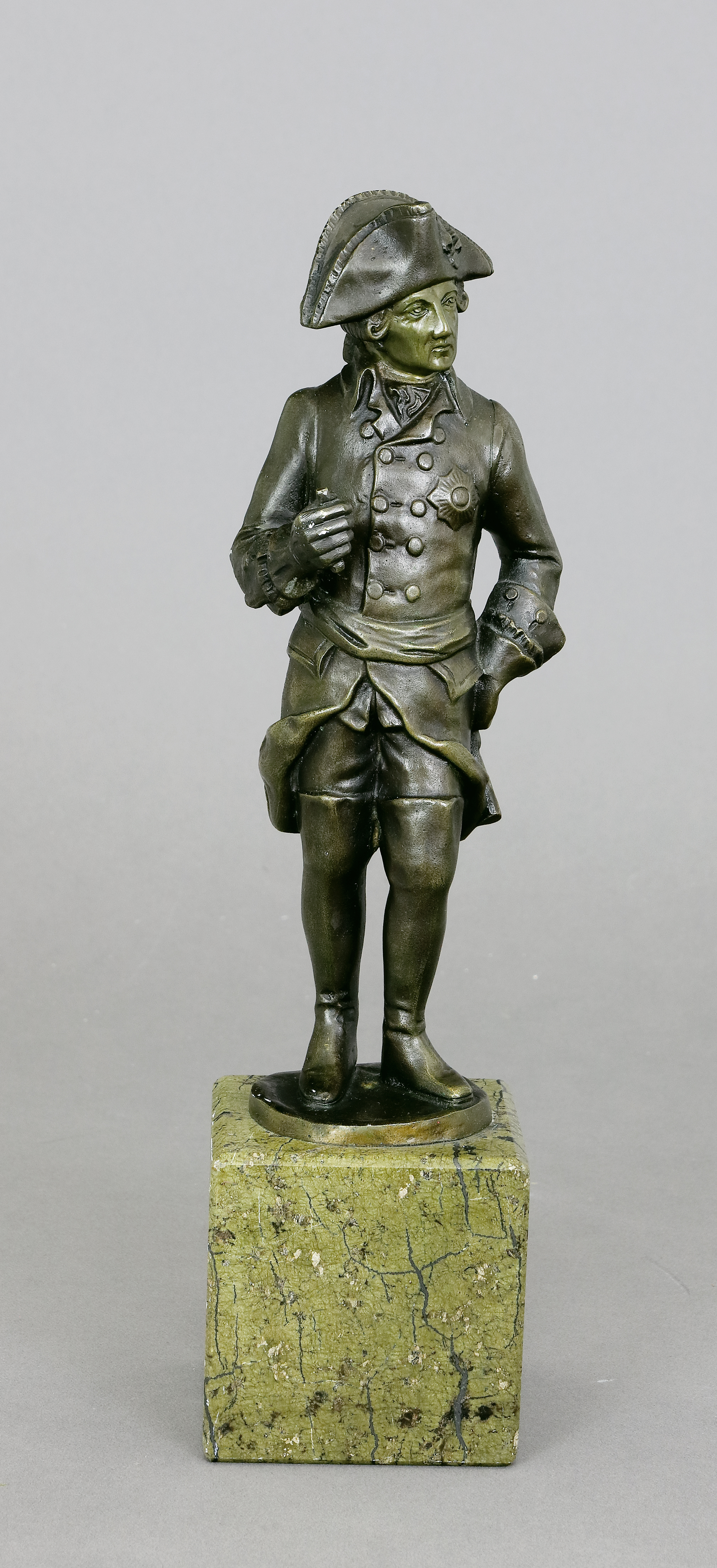 Bronze patiniert, auf würfelförmigem Serpentin-Sockel. H 19,5/26,5 cm. Bezeichnet. - Der Alte Fritz in Uniform mit Orden und unter geklemmtem Gehstock, in die Seite gestützter Linken. - Möglicherweise von Peder Marius Jensen (1883 Fredericia/DK). Ab 1901 in Dresden tätig, arbeitete später zusammen mit C. Bernewitz in Berlin und Kassel.  (1114-6)