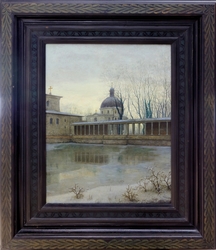 Die Friedenskirche im Marlygarten des Parks Sanssouci in Potsdam. Mit Säulengang und Mausoleum für Kaiser Friedrich III. Öl auf Leinwand. 91 x 70 cm, mit Rahmen 136 x 114,5 cm. Rechts unten signiert sowie rückseitig mit Nummern auf alten Papieretiketten. (1116-1)
