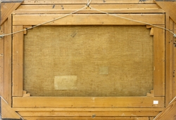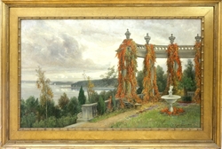 Wannseeufer mit bewachsener Pergola und kleinem Gartenbrunnen. Öl auf Leinwand. 65 x 110 cm, mit Rahmen 86 x 130 cm. Rechts unten signiert. Zwei hinterlegte Stellen. (1116-2)